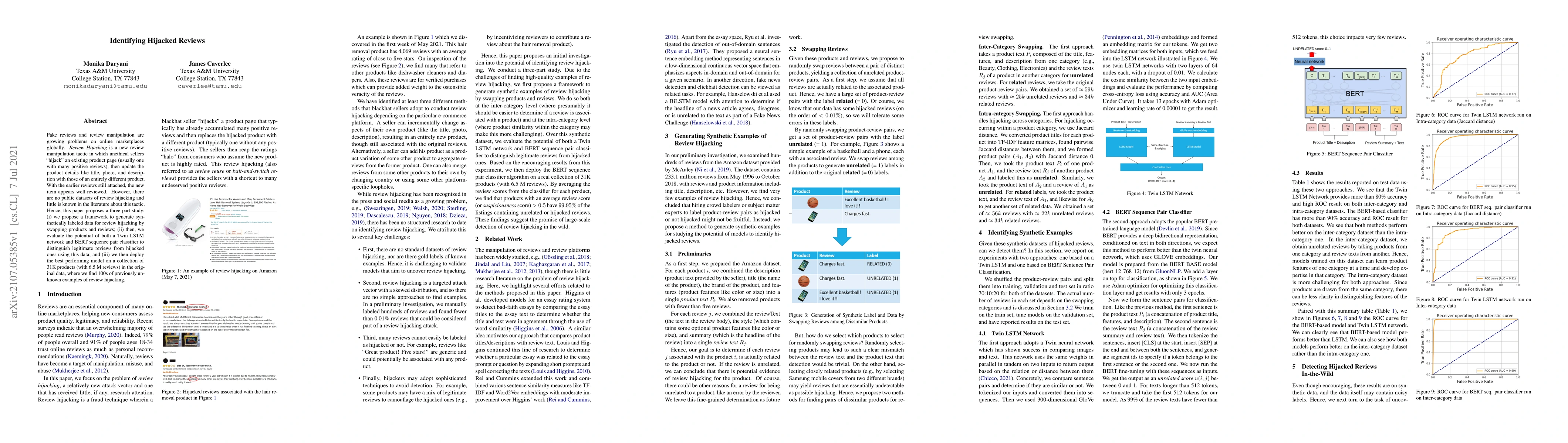 Fake reviews and review manipulation are growing problems on online marketplaces globally. Review Hijacking is a new review manipulation tactic in which unethical sellers "hijack" an existing product page (usually one with many positive reviews), then update the product details like title, photo, and description with those of an entirely different product. With the earlier reviews still attached, the new item appears well-reviewed. However, there are no public datasets of review hijacking and little is known in the literature about this tactic. Hence, this paper proposes a three-part study: (i) we propose a framework to generate synthetically labeled data for review hijacking by swapping products and reviews; (ii) then, we evaluate the potential of both a Twin LSTM network and BERT sequence pair classifier to distinguish legitimate reviews from hijacked ones using this data; and (iii) we then deploy the best performing model on a collection of 31K products (with 6.5 M reviews) in the original data, where we find 100s of previously unknown examples of review hijacking.