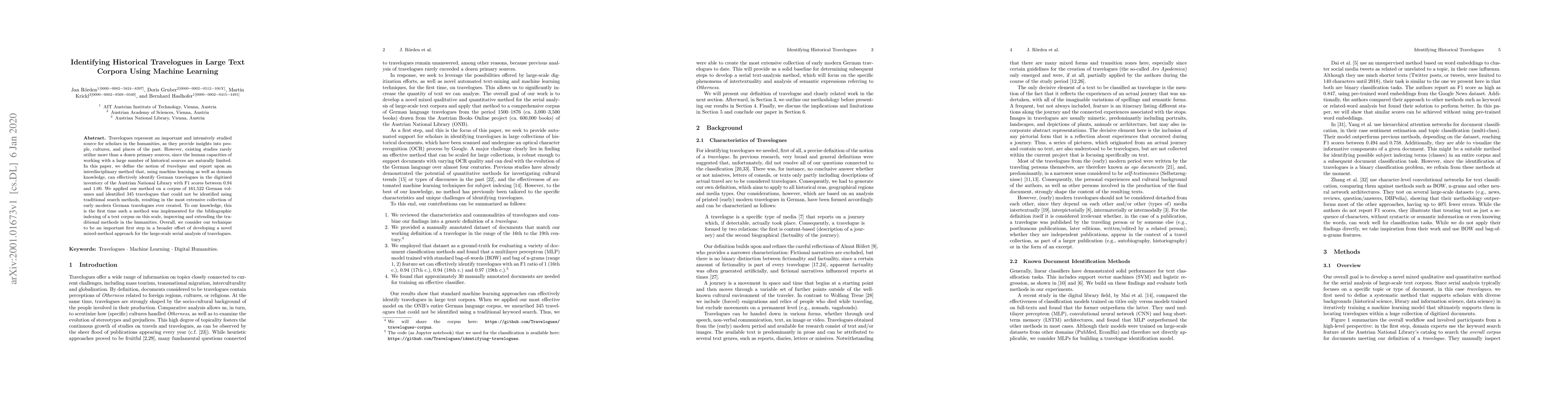 This paper presents a machine learning method to identify historical travelogues in large text corpora, achieving high accuracy in detecting German travelogues from the Austrian National Library's digitized inventory. The method identified 345 travelogues beyond traditional search methods, marking the largest collection of early modern German travelogues.