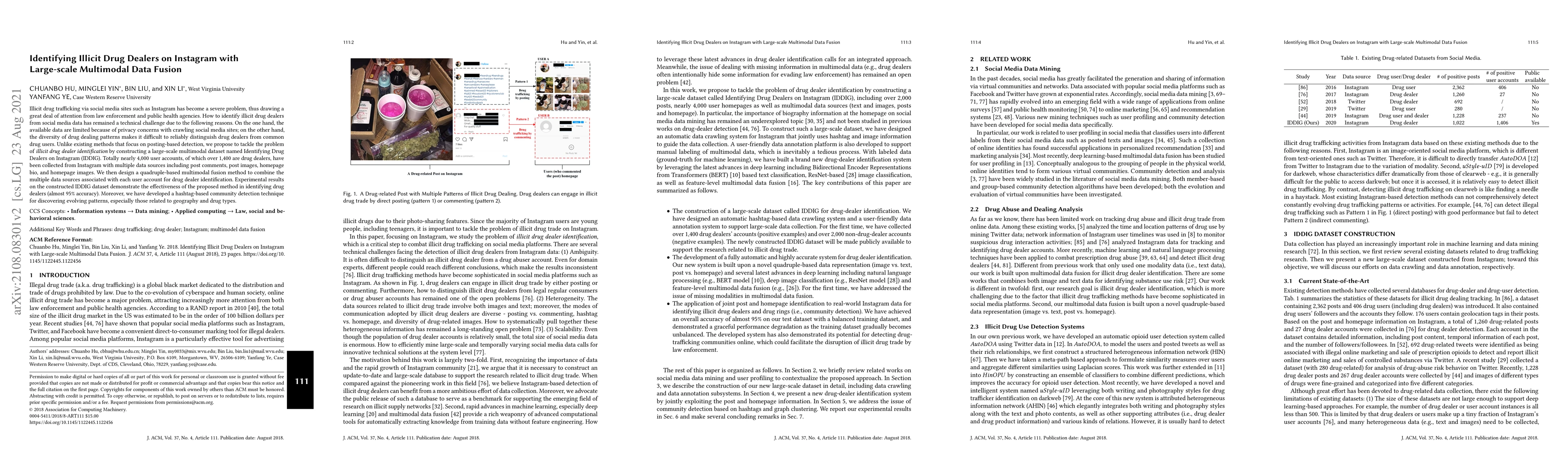 This paper proposes a method to identify illicit drug dealers on Instagram using a large-scale multimodal dataset and a quadruple-based fusion technique that combines various user data sources. Experimental results show nearly 95% accuracy in detection, and a hashtag-based community detection method is also developed for uncovering geographical and drug-type patterns.