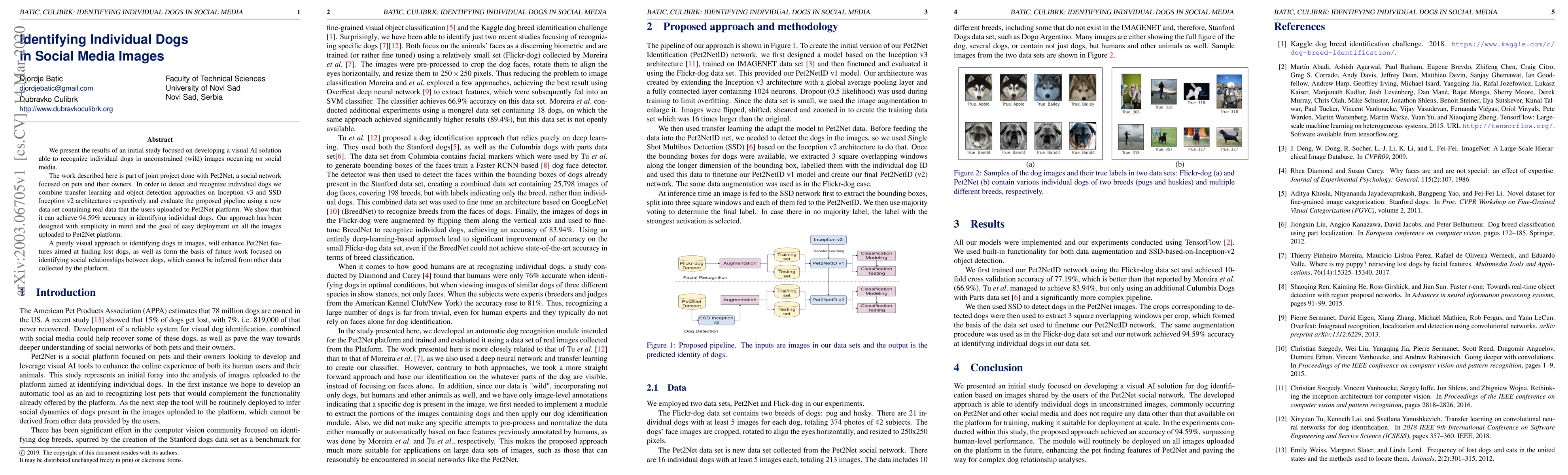 We present the results of an initial study focused on developing a visual AI solution able to recognize individual dogs in unconstrained (wild) images occurring on social media. The work described here is part of joint project done with Pet2Net, a social network focused on pets and their owners. In order to detect and recognize individual dogs we combine transfer learning and object detection approaches on Inception v3 and SSD Inception v2 architectures respectively and evaluate the proposed pipeline using a new data set containing real data that the users uploaded to Pet2Net platform. We show that it can achieve 94.59% accuracy in identifying individual dogs. Our approach has been designed with simplicity in mind and the goal of easy deployment on all the images uploaded to Pet2Net platform. A purely visual approach to identifying dogs in images, will enhance Pet2Net features aimed at finding lost dogs, as well as form the basis of future work focused on identifying social relationships between dogs, which cannot be inferred from other data collected by the platform.