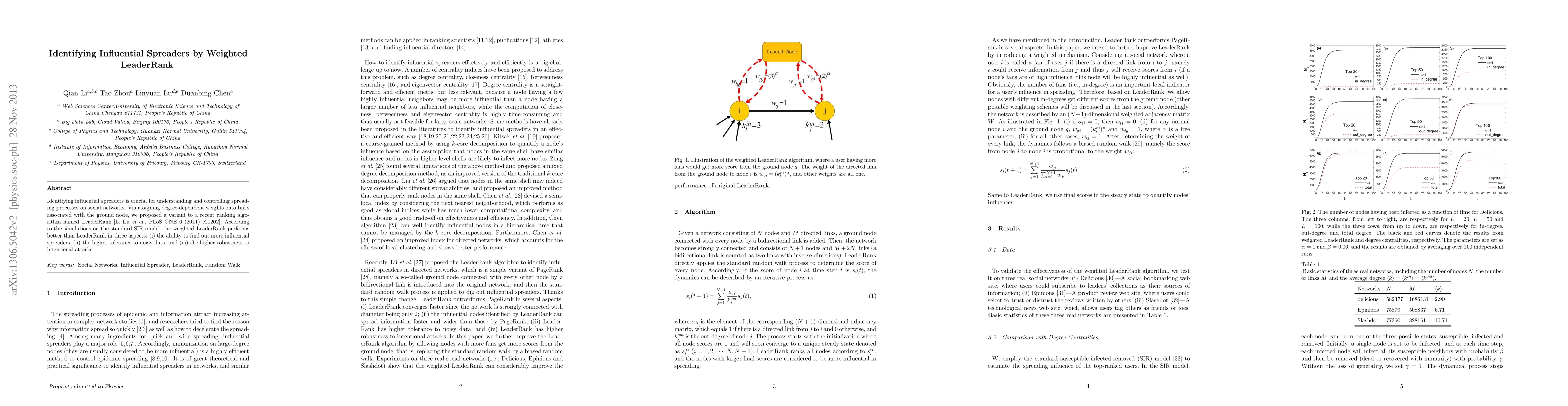This paper proposes a weighted LeaderRank algorithm to identify influential spreaders in social networks, outperforming the original LeaderRank in finding more influential nodes, handling noisy data better, and showing greater robustness against intentional attacks.