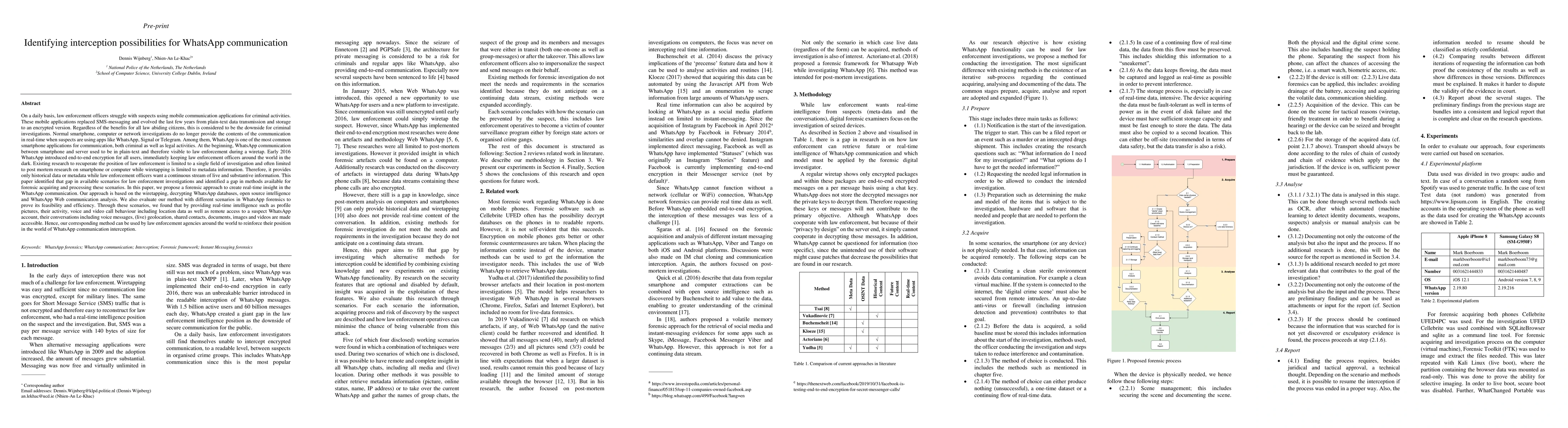 On a daily basis, law enforcement officers struggle with suspects using mobile communication applications for criminal activities. These mobile applications replaced SMS-messaging and evolved the last few years from plain-text data transmission and storage to an encrypted version. Regardless of the benefits for all law abiding citizens, this is considered to be the downside for criminal investigations. Normal smartphone, computer or network investigations do no longer provide the contents of the communication in real-time when suspects are using apps like WhatsApp, Signal or Telegram. Among them, WhatsApp is one of the most common smartphone applications for communication, both criminal as well as legal activities. Early 2016 WhatsApp introduced end-to-end encryption for all users, immediately keeping law enforcement officers around the world in the dark. Existing research to recuperate the position of law enforcement is limited to a single field of investigation and often limited to post mortem research on smartphone or computer while wiretapping is limited to metadata information. Therefore, it provides only historical data or metadata while law enforcement officers want a continuous stream of live and substantive information. This paper identified that gap in available scenarios for law enforcement investigations and identified a gap in methods available for forensic acquiring and processing these scenarios. In this paper, we propose a forensic approach to create real-time insight in the WhatsApp communication. Our approach is based on the wiretapping, decrypting WhatsApp databases, open source intelligence and WhatsApp Web communication analysis. We also evaluate our method with different scenarios in WhatsApp forensics to prove its feasibility and efficiency.