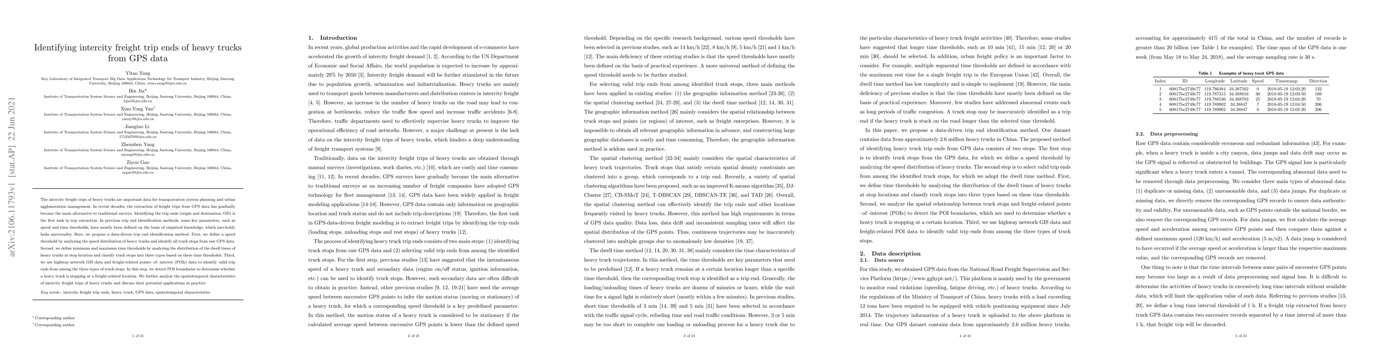This paper proposes a data-driven method for identifying the origin and destination of heavy trucks' intercity freight trips using GPS data. It classifies truck stops based on speed and dwell time thresholds, and uses GIS data and freight-related POIs to determine valid trip ends, offering a more universal approach than previous empirical methods.