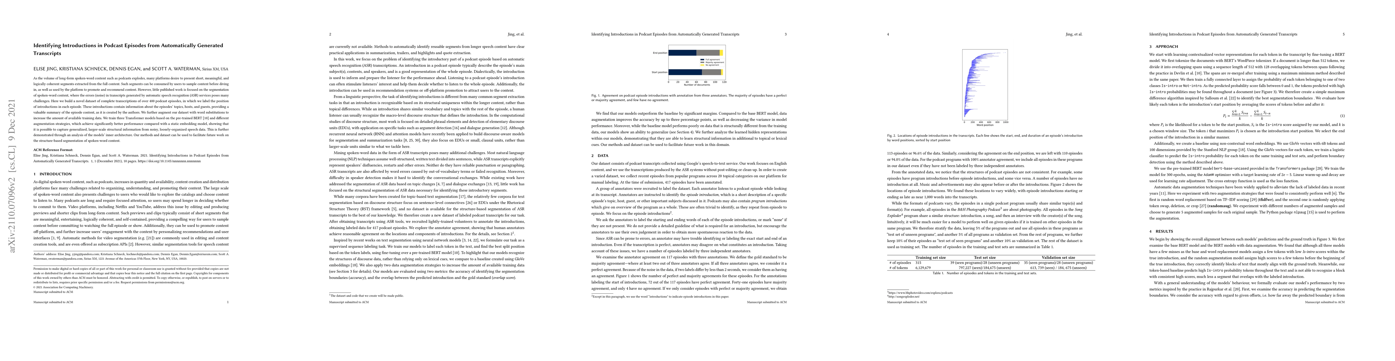 This paper introduces a novel dataset of transcriptions from over 400 podcast episodes, labeled with introductions, to aid in segmenting spoken-word content. The authors train Transformer models, achieving better performance than static embeddings, and demonstrate the potential to extract meaningful segments from noisy ASR transcripts for content sampling and recommendation.