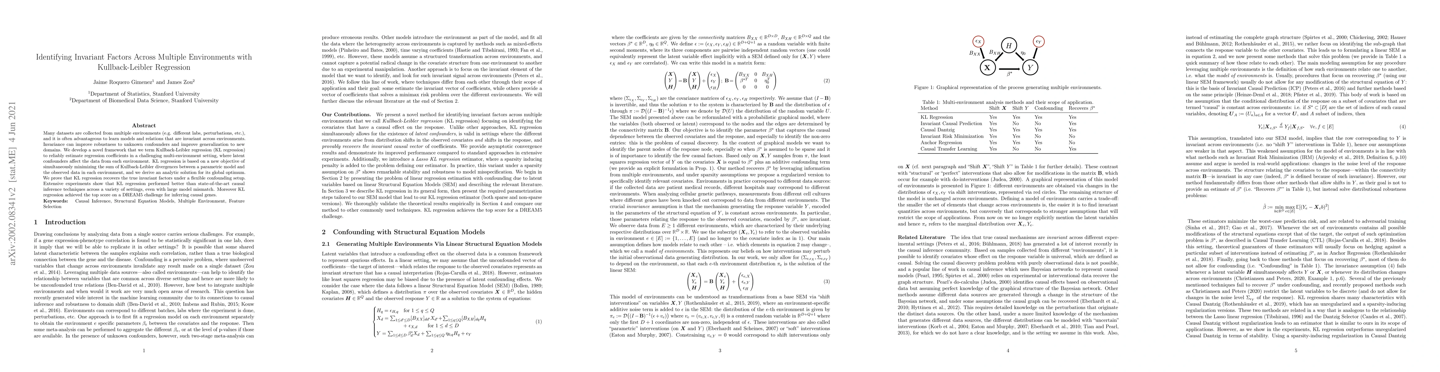Many datasets are collected from multiple environments (e.g. different labs, perturbations, etc.), and it is often advantageous to learn models and relations that are invariant across environments. Invariance can improve robustness to unknown confounders and improve generalization to new domains. We develop a novel framework -- KL regression -- to reliably estimate regression coefficients in a challenging multi-environment setting, where latent confounders affect the data from each environment. KL regression is based on a new objective of simultaneously minimizing the KL- divergence between a parametric model and the observed data from each environment. We prove that KL regression recovers the true invariant factors under a flexible confounding setup. Moreover, it is computationally efficient as we derive an analytic solution for its global optimum. In systematic experiments, we validate the improved performance of KL regression compared to commonly used approaches.