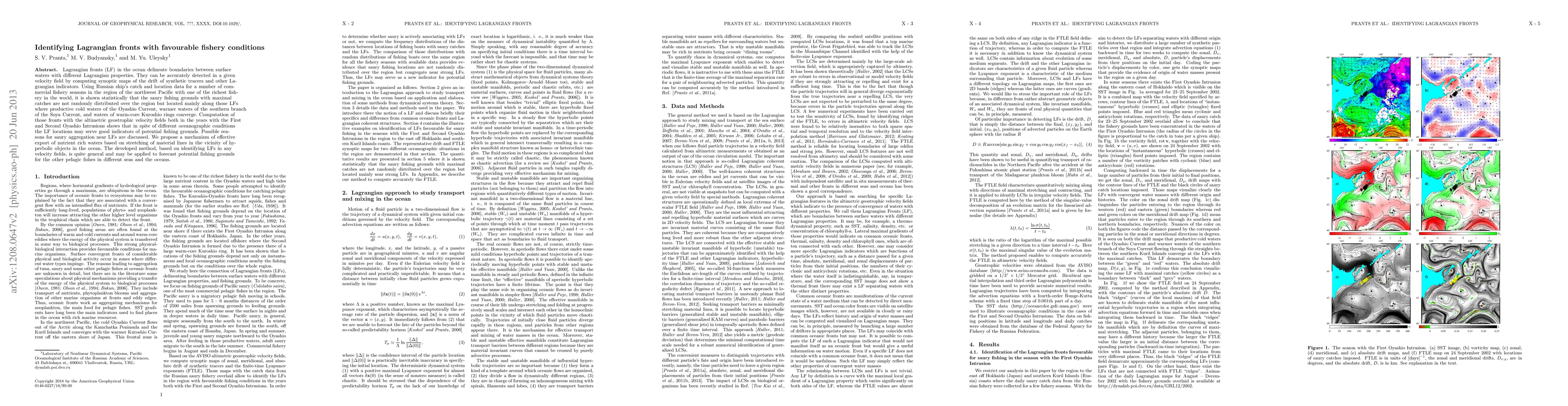 This study identifies Lagrangian fronts in the northwest Pacific as key indicators of saury fishing grounds, showing that maximal catches correlate with these fronts where different water masses converge. The method, based on altimetric velocity fields, can potentially forecast optimal fishing locations for other pelagic fish across various seas.