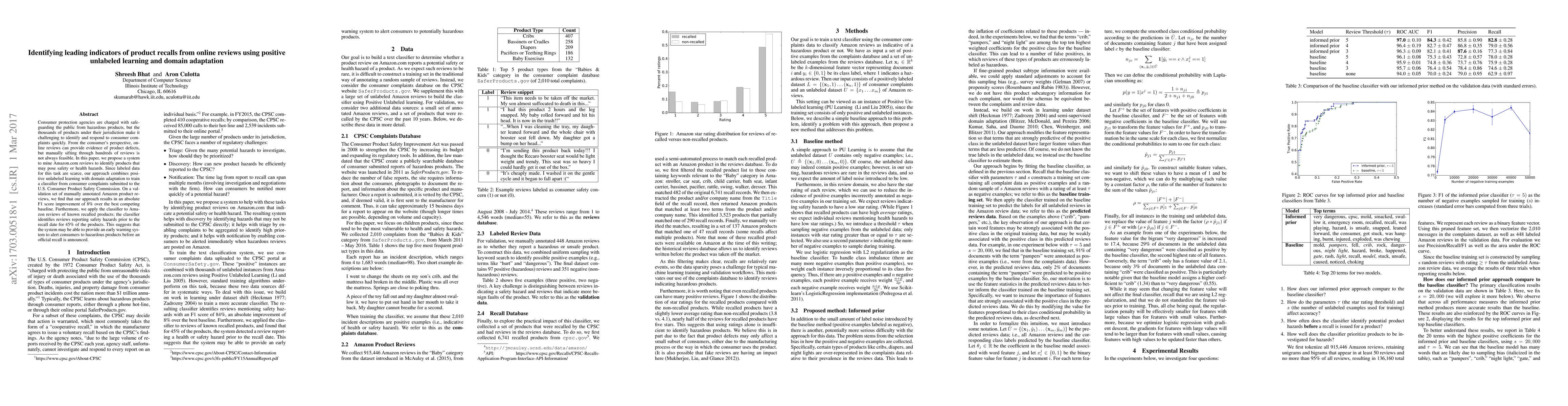 A system using positive unlabeled learning and domain adaptation was developed to identify products that may pose safety hazards from Amazon reviews, improving F1 score by 8% over competitors. The system can also detect safety hazards before official recalls.