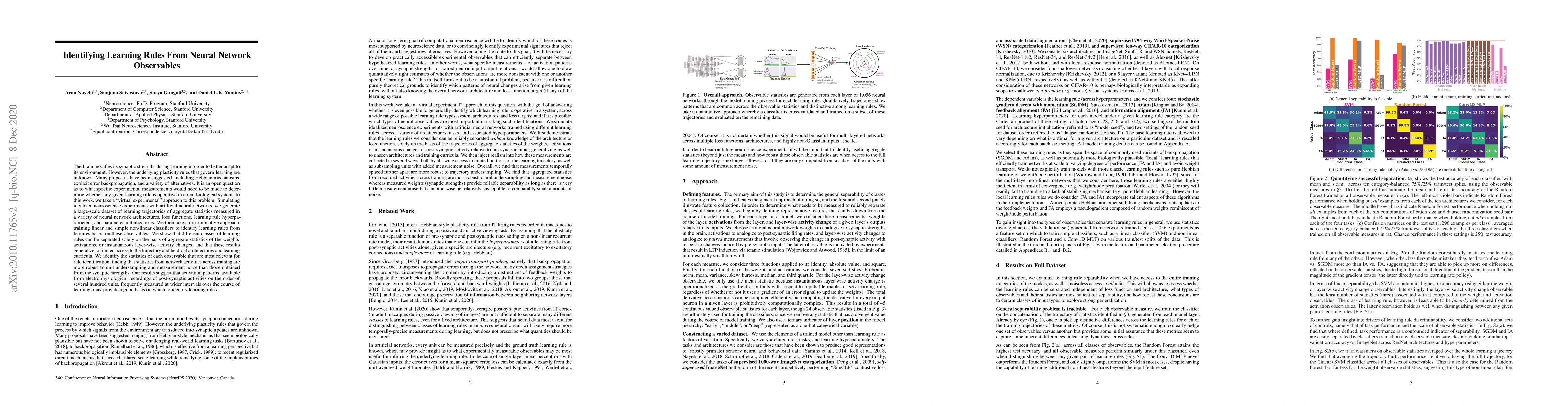 The brain modifies its synaptic strengths during learning in order to better adapt to its environment. However, the underlying plasticity rules that govern learning are unknown. Many proposals have been suggested, including Hebbian mechanisms, explicit error backpropagation, and a variety of alternatives. It is an open question as to what specific experimental measurements would need to be made to determine whether any given learning rule is operative in a real biological system. In this work, we take a "virtual experimental" approach to this problem. Simulating idealized neuroscience experiments with artificial neural networks, we generate a large-scale dataset of learning trajectories of aggregate statistics measured in a variety of neural network architectures, loss functions, learning rule hyperparameters, and parameter initializations. We then take a discriminative approach, training linear and simple non-linear classifiers to identify learning rules from features based on these observables. We show that different classes of learning rules can be separated solely on the basis of aggregate statistics of the weights, activations, or instantaneous layer-wise activity changes, and that these results generalize to limited access to the trajectory and held-out architectures and learning curricula. We identify the statistics of each observable that are most relevant for rule identification, finding that statistics from network activities across training are more robust to unit undersampling and measurement noise than those obtained from the synaptic strengths. Our results suggest that activation patterns, available from electrophysiological recordings of post-synaptic activities on the order of several hundred units, frequently measured at wider intervals over the course of learning, may provide a good basis on which to identify learning rules.