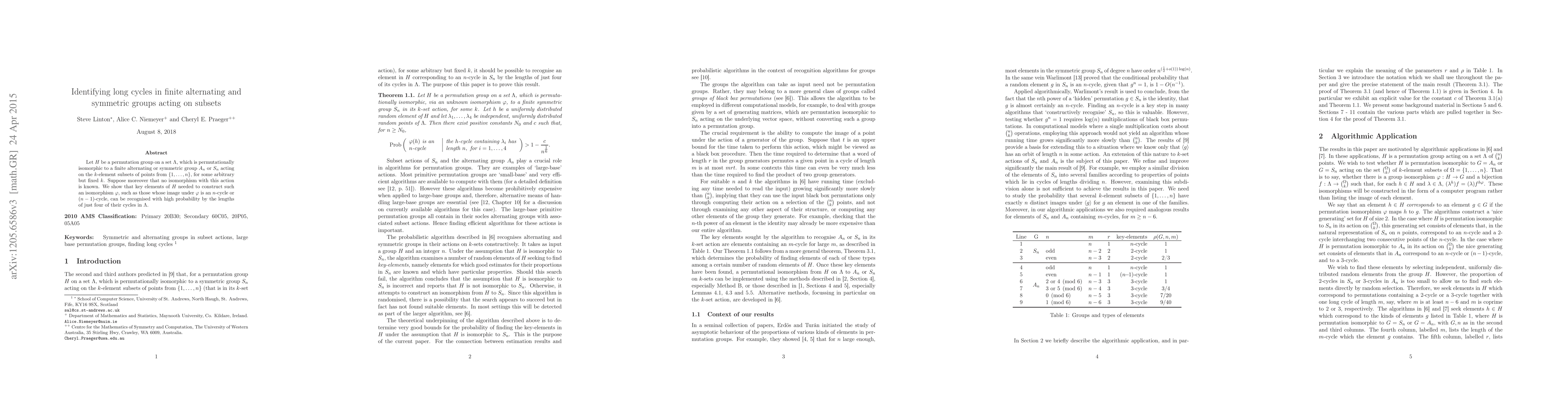 Let $H$ be a permutation group on a set $\Lambda$, which is permutationally isomorphic to a finite alternating or symmetric group $A_n$ or $S_n$ acting on the $k$-element subsets of points from $\{1,\ldots,n\}$, for some arbitrary but fixed $k$. Suppose moreover that no isomorphism with this action is known. We show that key elements of $H$ needed to construct such an isomorphism $\varphi$, such as those whose image under $\varphi$ is an $n$-cycle or $(n-1)$-cycle, can be recognised with high probability by the lengths of just four of their cycles in $\Lambda$.