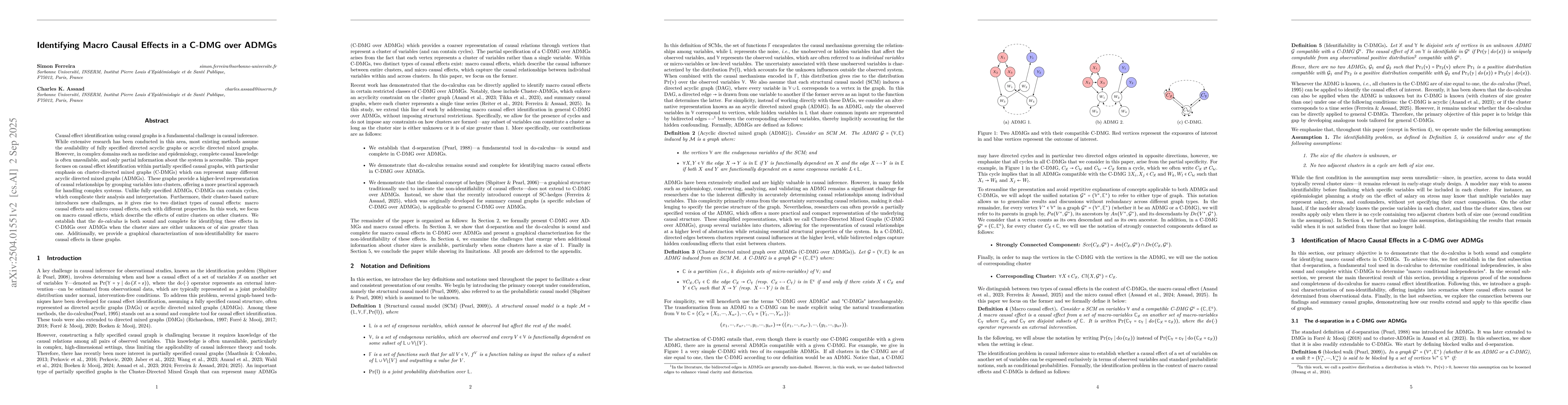 Causal effect identification using causal graphs is a fundamental challenge in causal inference. While extensive research has been conducted in this area, most existing methods assume the availability of fully specified directed acyclic graphs or acyclic directed mixed graphs. However, in complex domains such as medicine and epidemiology, complete causal knowledge is often unavailable, and only partial information about the system is accessible. This paper focuses on causal effect identification within partially specified causal graphs, with particular emphasis on cluster-directed mixed graphs (C-DMGs) which can represent many different acyclic directed mixed graphs (ADMGs). These graphs provide a higher-level representation of causal relationships by grouping variables into clusters, offering a more practical approach for handling complex systems. Unlike fully specified ADMGs, C-DMGs can contain cycles, which complicate their analysis and interpretation. Furthermore, their cluster-based nature introduces new challenges, as it gives rise to two distinct types of causal effects: macro causal effects and micro causal effects, each with different properties. In this work, we focus on macro causal effects, which describe the effects of entire clusters on other clusters. We establish that the do-calculus is both sound and complete for identifying these effects in C-DMGs over ADMGs when the cluster sizes are either unknown or of size greater than one. Additionally, we provide a graphical characterization of non-identifiability for macro causal effects in these graphs.