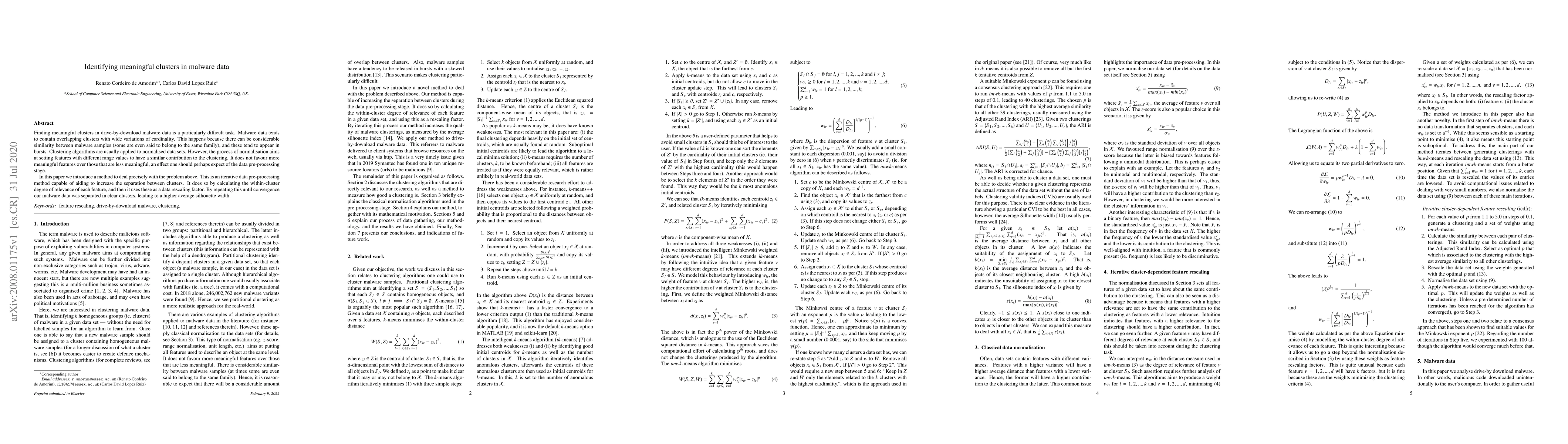 Finding meaningful clusters in drive-by-download malware data is a particularly difficult task. Malware data tends to contain overlapping clusters with wide variations of cardinality. This happens because there can be considerable similarity between malware samples (some are even said to belong to the same family), and these tend to appear in bursts. Clustering algorithms are usually applied to normalised data sets. However, the process of normalisation aims at setting features with different range values to have a similar contribution to the clustering. It does not favour more meaningful features over those that are less meaningful, an effect one should perhaps expect of the data pre-processing stage. In this paper we introduce a method to deal precisely with the problem above. This is an iterative data pre-processing method capable of aiding to increase the separation between clusters. It does so by calculating the within-cluster degree of relevance of each feature, and then it uses these as a data rescaling factor. By repeating this until convergence our malware data was separated in clear clusters, leading to a higher average silhouette width.