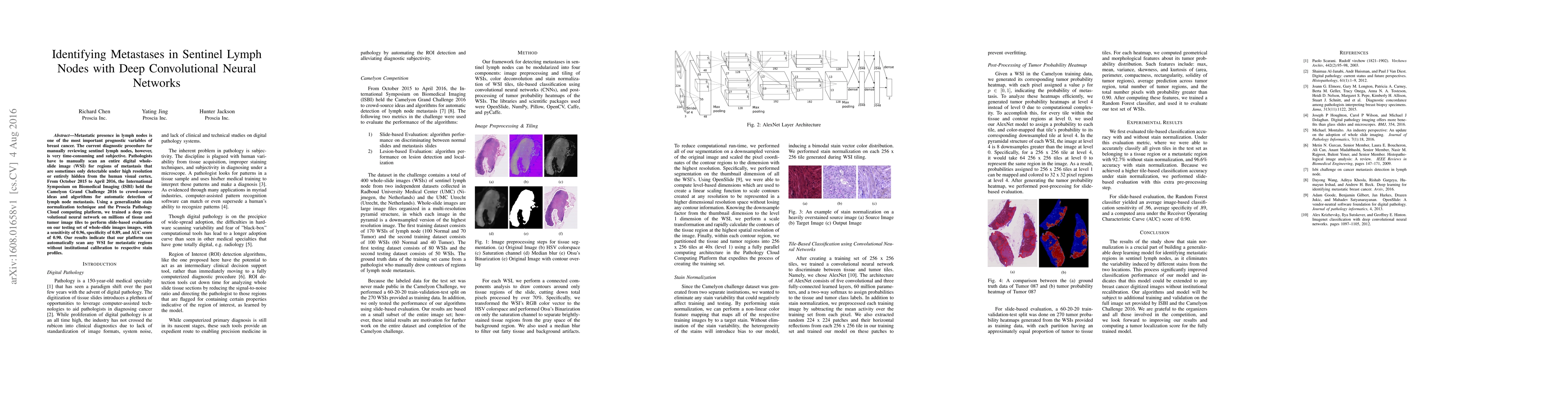 This study developed a deep convolutional neural network to automatically identify metastatic regions in sentinel lymph nodes from breast cancer patients, achieving high sensitivity and specificity. The platform, trained on millions of tissue images, can perform whole-slide image evaluations without needing specific institutional calibration.