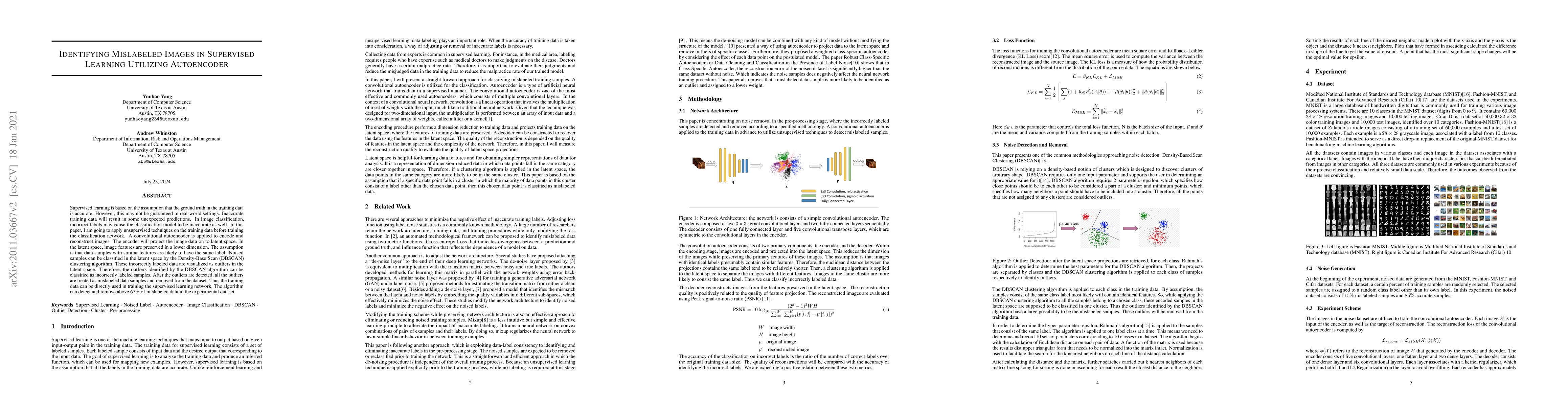 This paper proposes using a convolutional autoencoder and DBSCAN clustering to identify mislabeled images in supervised learning datasets. By encoding images into a latent space and detecting outliers, the method successfully removes over 67% of mislabeled samples, improving the accuracy of subsequent supervised learning models.