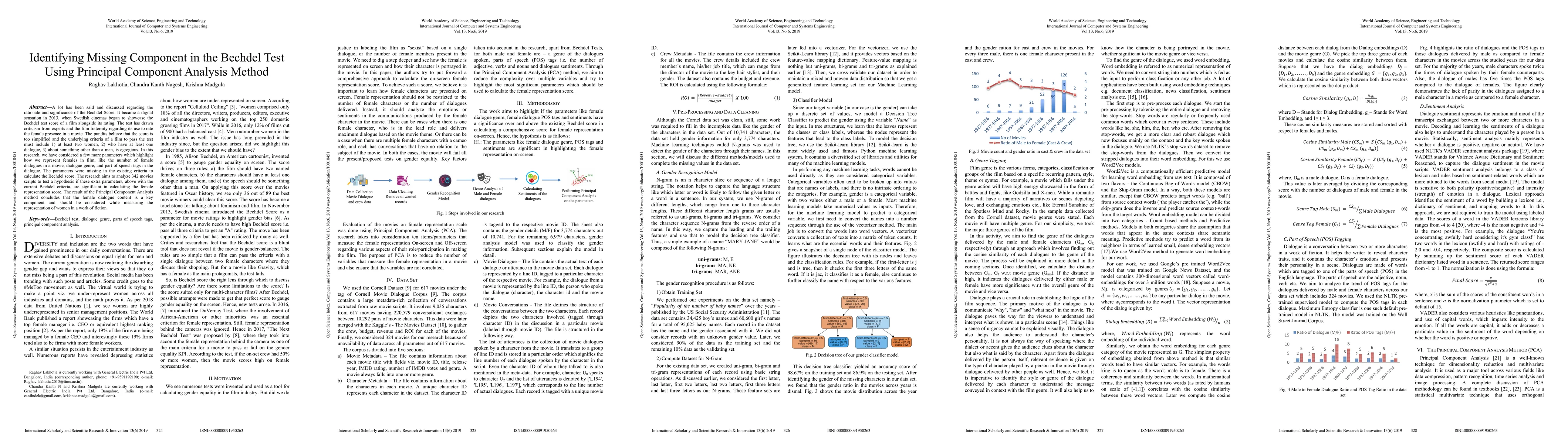 A lot has been said and discussed regarding the rationale and significance of the Bechdel Score. It became a digital sensation in 2013 when Swedish cinemas began to showcase the Bechdel test score of a film alongside its rating. The test has drawn criticism from experts and the film fraternity regarding its use to rate the female presence in a movie. The pundits believe that the score is too simplified and the underlying criteria of a film to pass the test must include 1) at least two women, 2) who have at least one dialogue, 3) about something other than a man, is egregious. In this research, we have considered a few more parameters which highlight how we represent females in film, like the number of female dialogues in a movie, dialogue genre, and part of speech tags in the dialogue. The parameters were missing in the existing criteria to calculate the Bechdel score. The research aims to analyze 342 movies scripts to test a hypothesis if these extra parameters, above with the current Bechdel criteria, are significant in calculating the female representation score. The result of the Principal Component Analysis method concludes that the female dialogue content is a key component and should be considered while measuring the representation of women in a work of fiction.