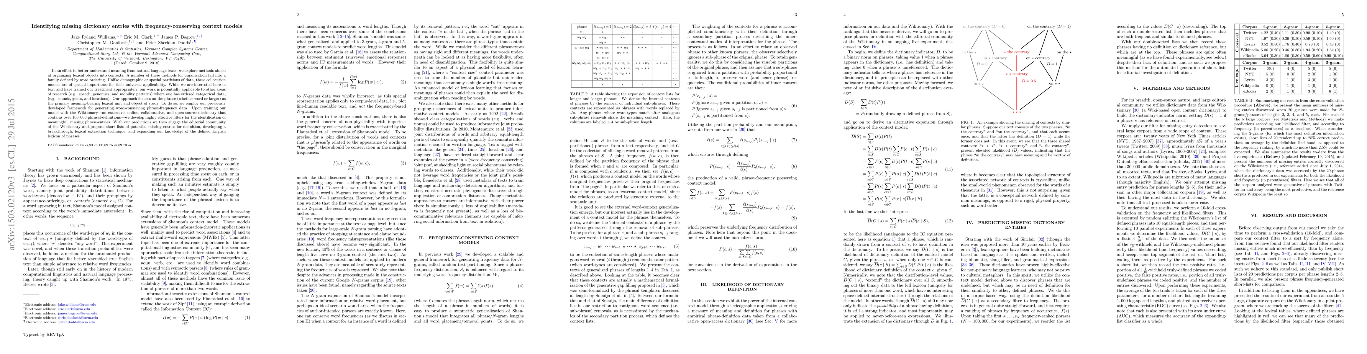 In an effort to better understand meaning from natural language texts, we explore methods aimed at organizing lexical objects into contexts. A number of these methods for organization fall into a family defined by word ordering. Unlike demographic or spatial partitions of data, these collocation models are of special importance for their universal applicability. While we are interested here in text and have framed our treatment appropriately, our work is potentially applicable to other areas of research (e.g., speech, genomics, and mobility patterns) where one has ordered categorical data, (e.g., sounds, genes, and locations). Our approach focuses on the phrase (whether word or larger) as the primary meaning-bearing lexical unit and object of study. To do so, we employ our previously developed framework for generating word-conserving phrase-frequency data. Upon training our model with the Wiktionary---an extensive, online, collaborative, and open-source dictionary that contains over 100,000 phrasal-definitions---we develop highly effective filters for the identification of meaningful, missing phrase-entries. With our predictions we then engage the editorial community of the Wiktionary and propose short lists of potential missing entries for definition, developing a breakthrough, lexical extraction technique, and expanding our knowledge of the defined English lexicon of phrases.