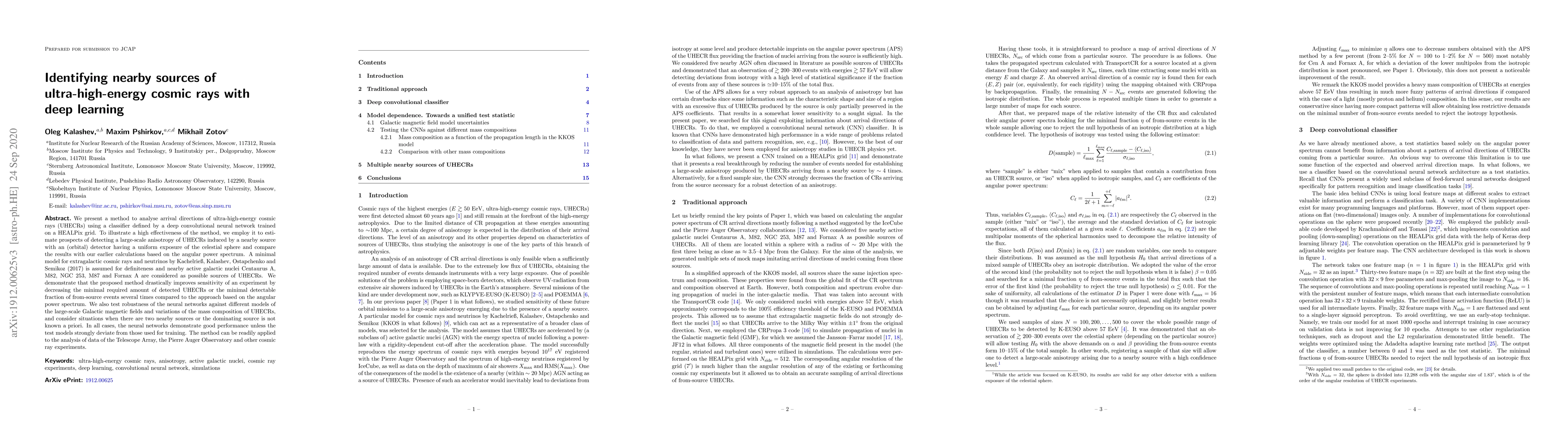 This paper proposes a deep convolutional neural network classifier to analyze the arrival directions of ultra-high-energy cosmic rays (UHECRs), significantly improving the detection sensitivity of nearby source anisotropies compared to traditional angular power spectrum methods. The method's robustness is tested under various cosmic ray models and magnetic field scenarios.