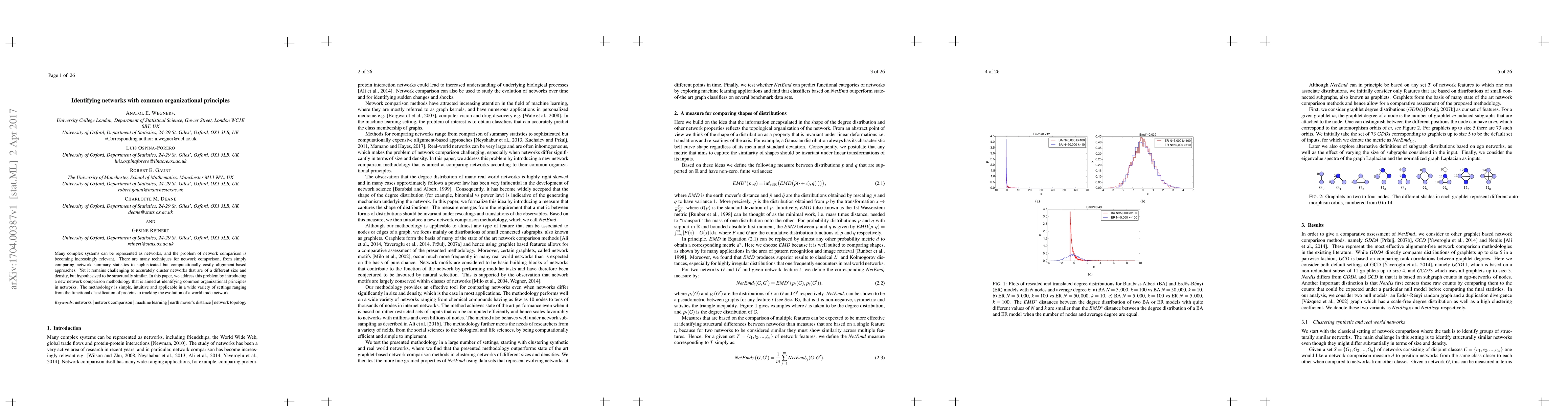 Many complex systems can be represented as networks, and the problem of network comparison is becoming increasingly relevant. There are many techniques for network comparison, from simply comparing network summary statistics to sophisticated but computationally costly alignment-based approaches. Yet it remains challenging to accurately cluster networks that are of a different size and density, but hypothesized to be structurally similar. In this paper, we address this problem by introducing a new network comparison methodology that is aimed at identifying common organizational principles in networks. The methodology is simple, intuitive and applicable in a wide variety of settings ranging from the functional classification of proteins to tracking the evolution of a world trade network.