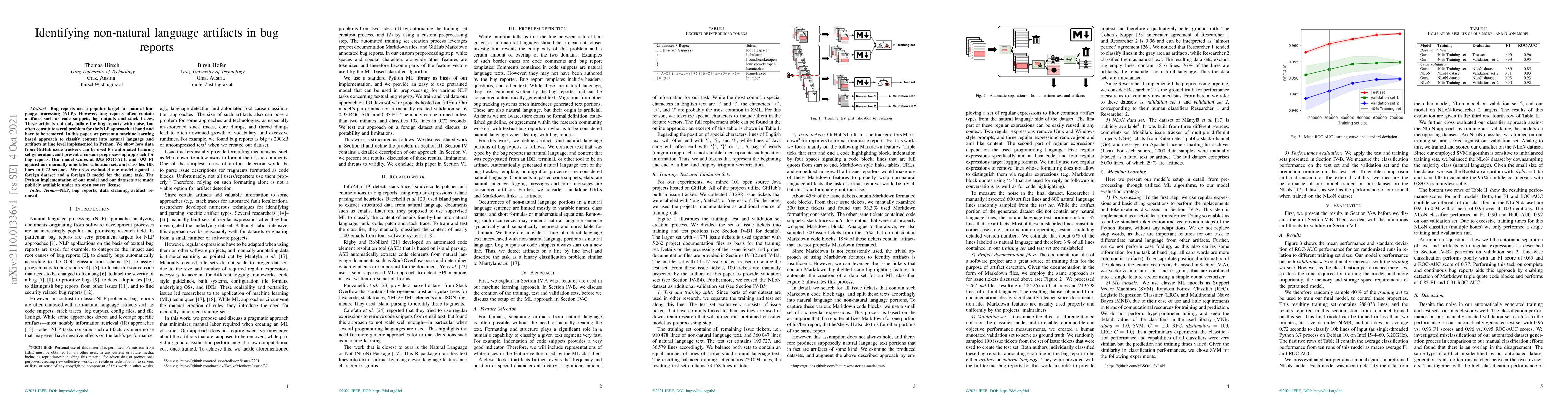 This paper proposes a machine learning method to distinguish between natural language and non-natural language artifacts in bug reports, using GitHub data for training. The model achieves a high ROC-AUC score of 0.95 and an F1 score of 0.93, and is publicly available under an open source license.