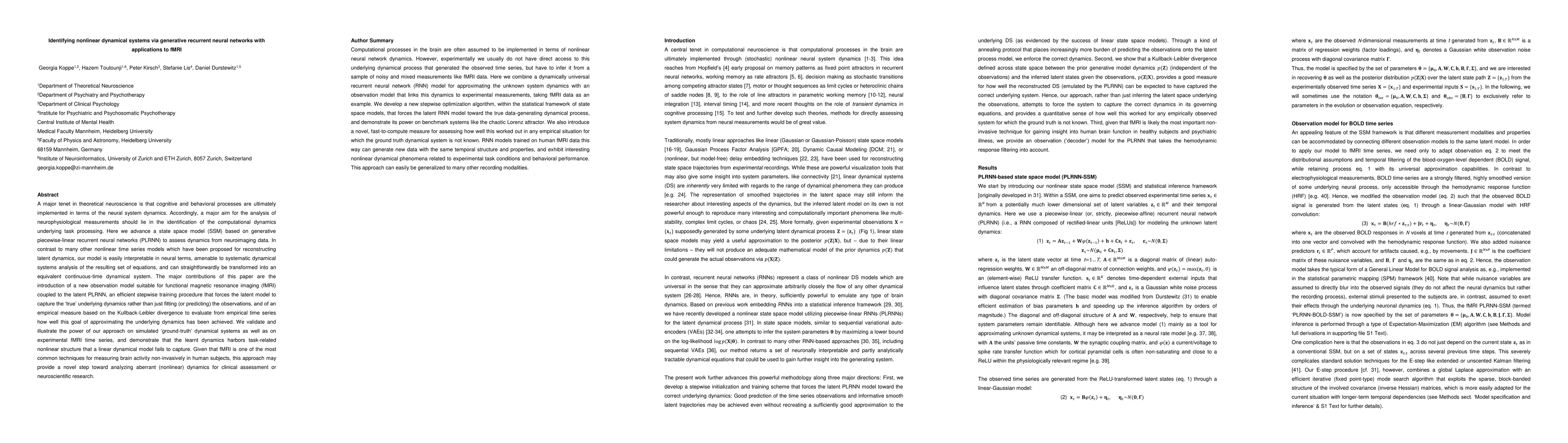 This paper proposes a generative piecewise-linear recurrent neural network (PLRNN) state space model to identify nonlinear dynamics in fMRI data, offering an interpretable and analytically tractable framework for understanding neural system dynamics. The approach includes a novel observation model, efficient training procedure, and a Kullback-Leibler divergence-based measure to evaluate dynamic approximation, validated on both simulated and real fMRI data.