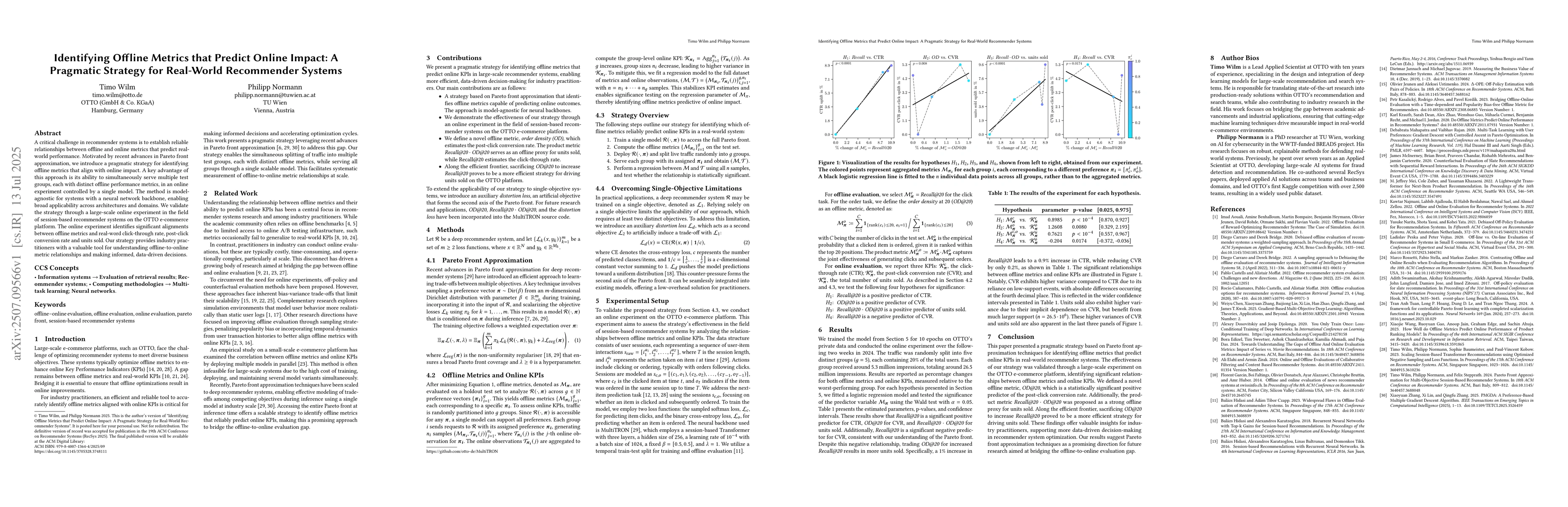 A critical challenge in recommender systems is to establish reliable relationships between offline and online metrics that predict real-world performance. Motivated by recent advances in Pareto front approximation, we introduce a pragmatic strategy for identifying offline metrics that align with online impact. A key advantage of this approach is its ability to simultaneously serve multiple test groups, each with distinct offline performance metrics, in an online experiment controlled by a single model. The method is model-agnostic for systems with a neural network backbone, enabling broad applicability across architectures and domains. We validate the strategy through a large-scale online experiment in the field of session-based recommender systems on the OTTO e-commerce platform. The online experiment identifies significant alignments between offline metrics and real-word click-through rate, post-click conversion rate and units sold. Our strategy provides industry practitioners with a valuable tool for understanding offline-to-online metric relationships and making informed, data-driven decisions.