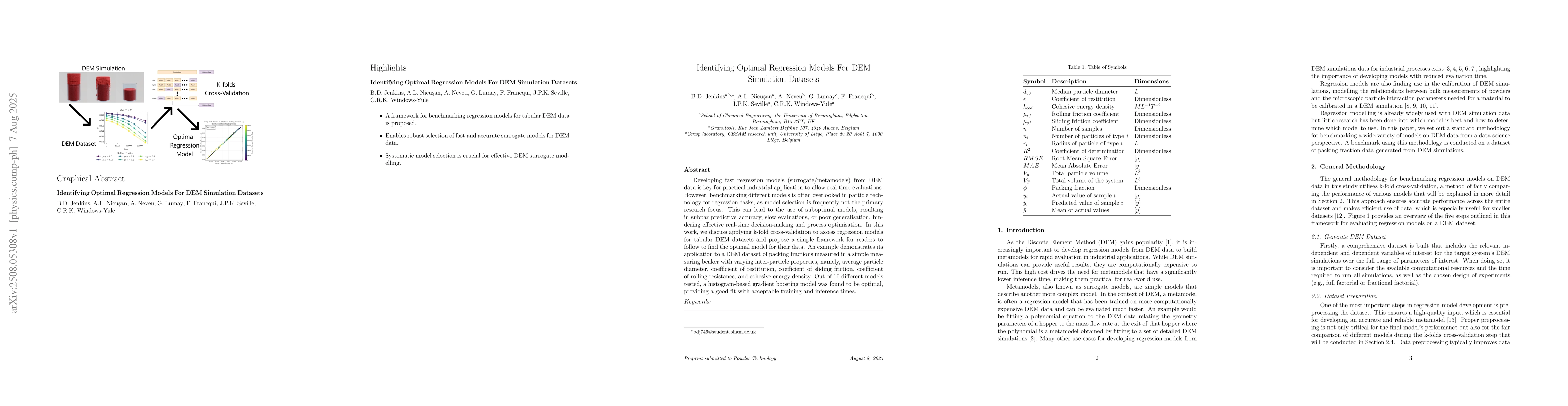 Developing fast regression models (surrogate/metamodels) from DEM data is key for practical industrial application to allow real-time evaluations. However, benchmarking different models is often overlooked in particle technology for regression tasks, as model selection is frequently not the primary research focus. This can lead to the use of suboptimal models, resulting in subpar predictive accuracy, slow evaluations, or poor generalisation, hindering effective real-time decision-making and process optimisation. In this work, we discuss applying k-fold cross-validation to assess regression models for tabular DEM datasets and propose a simple framework for readers to follow to find the optimal model for their data. An example demonstrates its application to a DEM dataset of packing fractions measured in a simple measuring beaker with varying inter-particle properties, namely, average particle diameter, coefficient of restitution, coefficient of sliding friction, coefficient of rolling resistance, and cohesive energy density. Out of 16 different models tested, a histogram-based gradient boosting model was found to be optimal, providing a good fit with acceptable training and inference times.