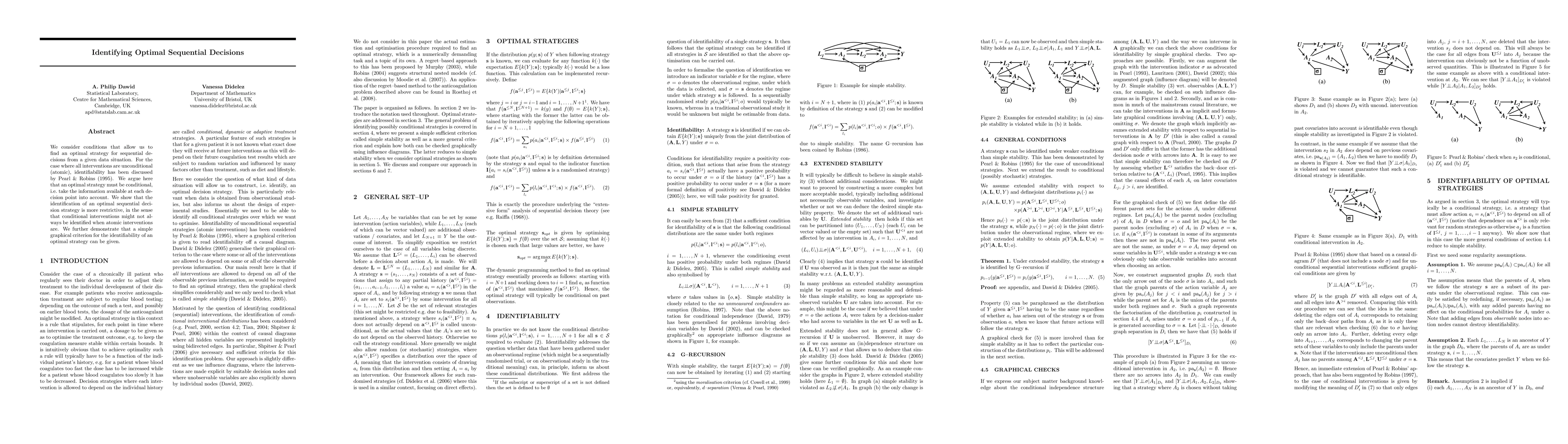 This paper explores the conditions for identifying optimal strategies for sequential decisions, arguing that conditional strategies, which consider available information at each decision point, are necessary. It highlights that conditional interventions may not always be identifiable, unlike unconditional ones, and proposes a graphical criterion for determining the identifiability of optimal strategies.