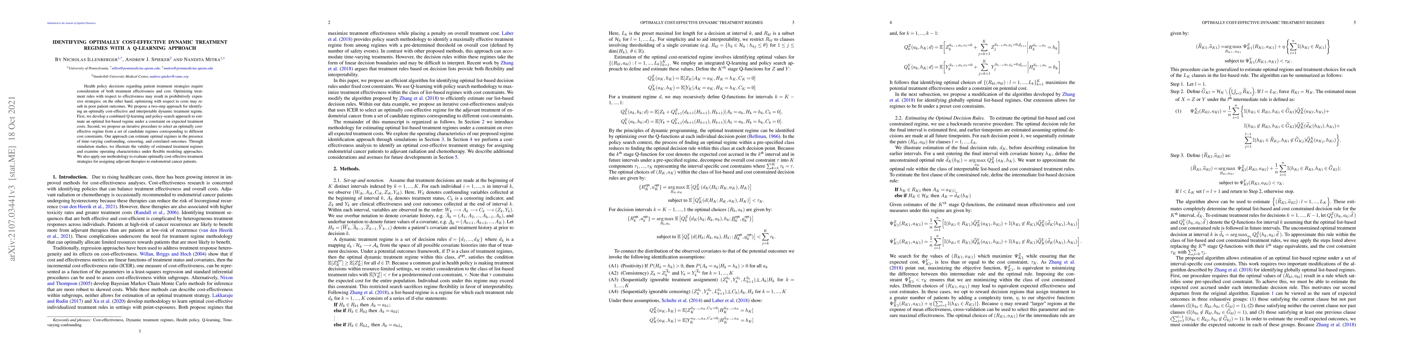 This paper proposes a Q-learning and policy-search approach to identify cost-effective dynamic treatment regimes, balancing treatment effectiveness and cost. The method estimates optimal regimes under cost constraints and is validated through simulations and application to endometrial cancer treatment.