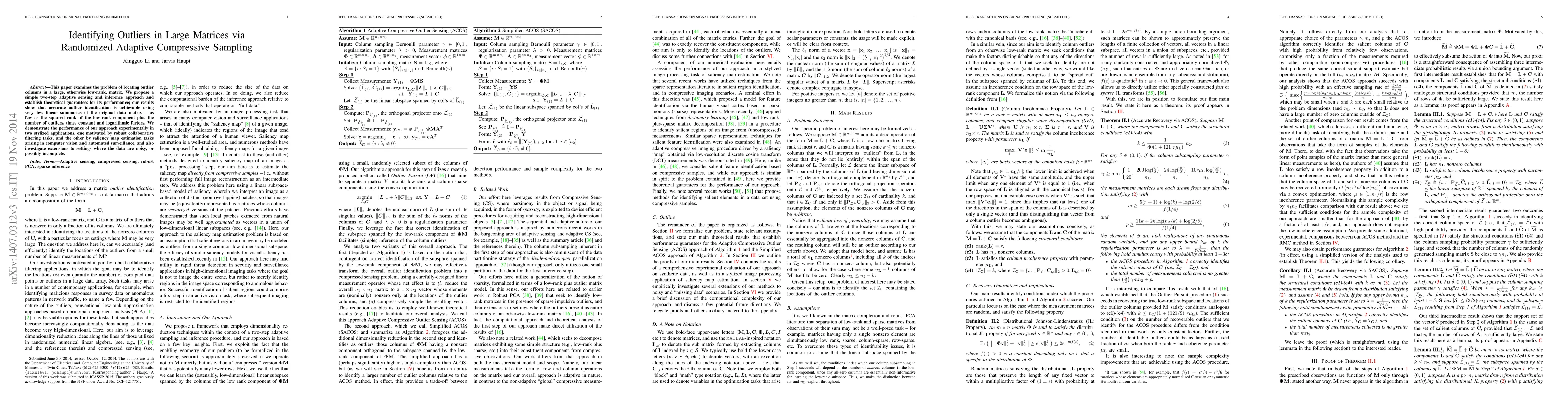 This paper examines the problem of locating outlier columns in a large, otherwise low-rank, matrix. We propose a simple two-step adaptive sensing and inference approach and establish theoretical guarantees for its performance; our results show that accurate outlier identification is achievable using very few linear summaries of the original data matrix -- as few as the squared rank of the low-rank component plus the number of outliers, times constant and logarithmic factors. We demonstrate the performance of our approach experimentally in two stylized applications, one motivated by robust collaborative filtering tasks, and the other by saliency map estimation tasks arising in computer vision and automated surveillance, and also investigate extensions to settings where the data are noisy, or possibly incomplete.