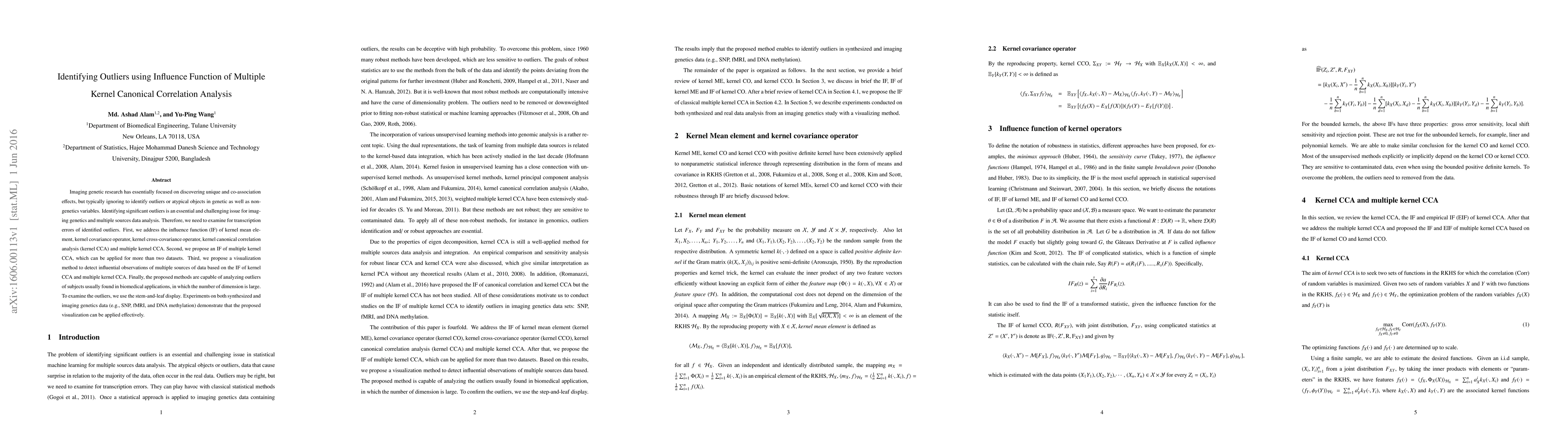 Imaging genetic research has essentially focused on discovering unique and co-association effects, but typically ignoring to identify outliers or atypical objects in genetic as well as non-genetics variables. Identifying significant outliers is an essential and challenging issue for imaging genetics and multiple sources data analysis. Therefore, we need to examine for transcription errors of identified outliers. First, we address the influence function (IF) of kernel mean element, kernel covariance operator, kernel cross-covariance operator, kernel canonical correlation analysis (kernel CCA) and multiple kernel CCA. Second, we propose an IF of multiple kernel CCA, which can be applied for more than two datasets. Third, we propose a visualization method to detect influential observations of multiple sources of data based on the IF of kernel CCA and multiple kernel CCA. Finally, the proposed methods are capable of analyzing outliers of subjects usually found in biomedical applications, in which the number of dimension is large. To examine the outliers, we use the stem-and-leaf display. Experiments on both synthesized and imaging genetics data (e.g., SNP, fMRI, and DNA methylation) demonstrate that the proposed visualization can be applied effectively.