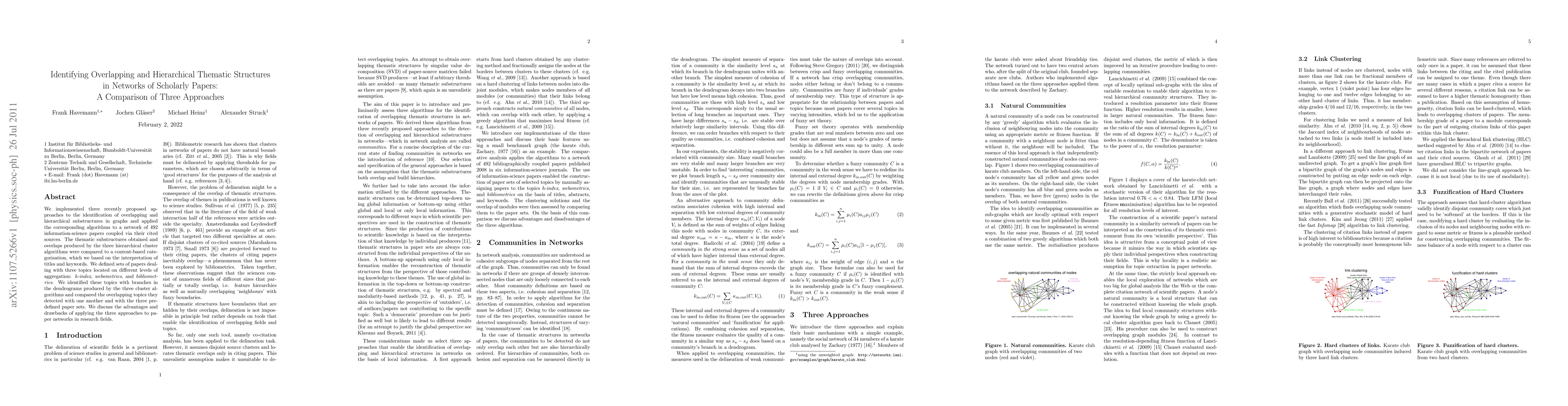 We implemented three recently proposed approaches to the identification of overlapping and hierarchical substructures in graphs and applied the corresponding algorithms to a network of 492 information-science papers coupled via their cited sources. The thematic substructures obtained and overlaps produced by the three hierarchical cluster algorithms were compared to a content-based categorisation, which we based on the interpretation of titles and keywords. We defined sets of papers dealing with three topics located on different levels of aggregation: h-index, webometrics, and bibliometrics. We identified these topics with branches in the dendrograms produced by the three cluster algorithms and compared the overlapping topics they detected with one another and with the three pre-defined paper sets. We discuss the advantages and drawbacks of applying the three approaches to paper networks in research fields.