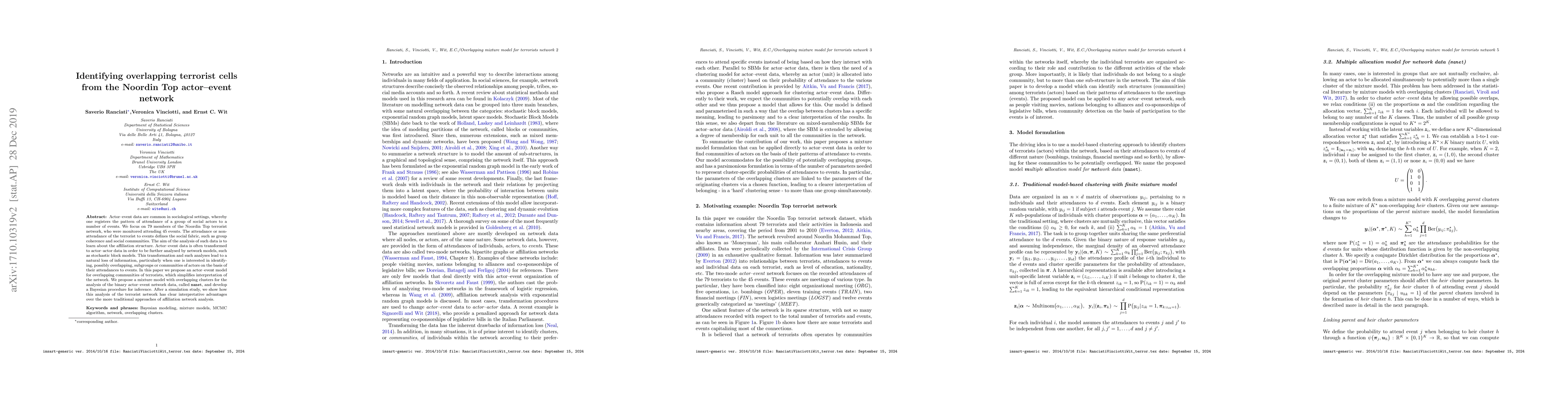 Actor-event data are common in sociological settings, whereby one registers the pattern of attendance of a group of social actors to a number of events. We focus on 79 members of the Noordin Top terrorist network, who were monitored attending 45 events. The attendance or non-attendance of the terrorist to events defines the social fabric, such as group coherence and social communities. The aim of the analysis of such data is to learn about the affiliation structure. Actor-event data is often transformed to actor-actor data in order to be further analysed by network models, such as stochastic block models. This transformation and such analyses lead to a natural loss of information, particularly when one is interested in identifying, possibly overlapping, subgroups or communities of actors on the basis of their attendances to events. In this paper we propose an actor-event model for overlapping communities of terrorists, which simplifies interpretation of the network. We propose a mixture model with overlapping clusters for the analysis of the binary actor-event network data, called {\tt manet}, and develop a Bayesian procedure for inference. After a simulation study, we show how this analysis of the terrorist network has clear interpretative advantages over the more traditional approaches of affiliation network analysis.