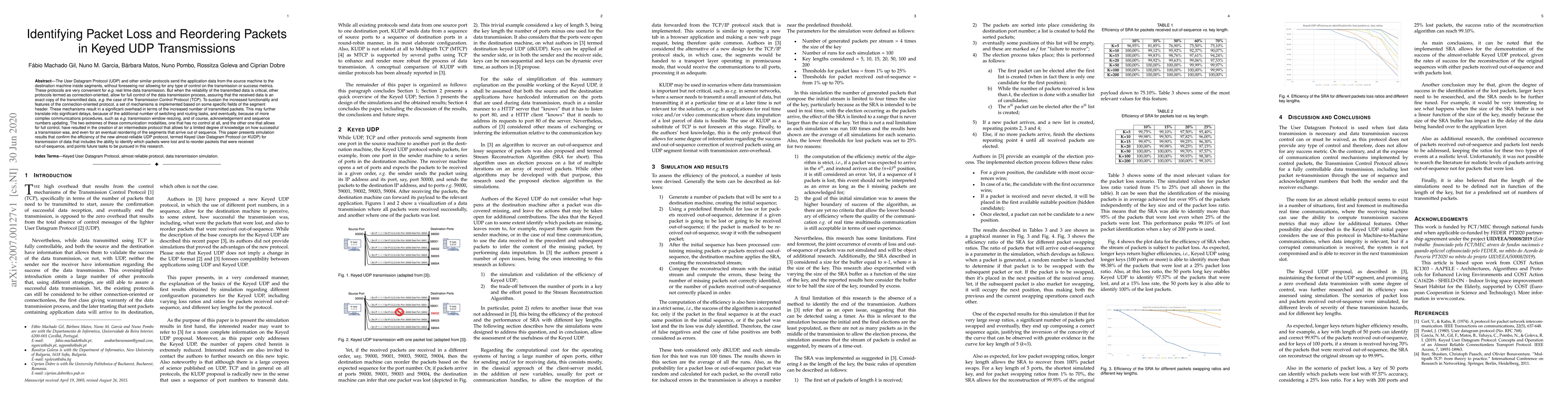 The User Datagram Protocol (UDP) and other similar protocols send the application data from the source machine to the destination machine inside segments, without foreseeing nor allowing for any type of control on the transmission or success metrics. These protocols are very convenient for e.g. real time data transmission. But when the reliability of the transmitted data is critical, other protocols termed as connection-oriented, allow for full control of the data transmission process, assuring that the received data is an exact copy of the transmitted data, e.g. the case of the Transmission Control Protocol (TCP). To sustain the increased functionality and features of the connection-oriented protocol, a set of mechanisms is implemented based on some specific fields of the segment header. These mechanisms result in a significant overhead in terms of the increased number of transmitted packets. This may further translate into significant delays, because of the additional number of switching and routing tasks, and eventually, because of more complex communications procedures, such as e.g. transmission window resizing, and of course, acknowledgement and sequence numbers updating. The two extremes of these communication modalities, one that has no control at all, and the other one that allows for full control, have resulted in the creation of an intermediate protocol that allows for a limited degree of knowledge on how successful a transmission was, and even for an eventual reordering of the segments that arrive out of sequence. This paper presents simulation results that confirm the efficiency of the new almost-reliable UDP protocol, termed Keyed User Datagram Protocol (or KUDP) for transmission of data that includes the ability to identify which packets were lost and to reorder packets that were received out-of-sequence, and points future tasks to be pursued in this research.