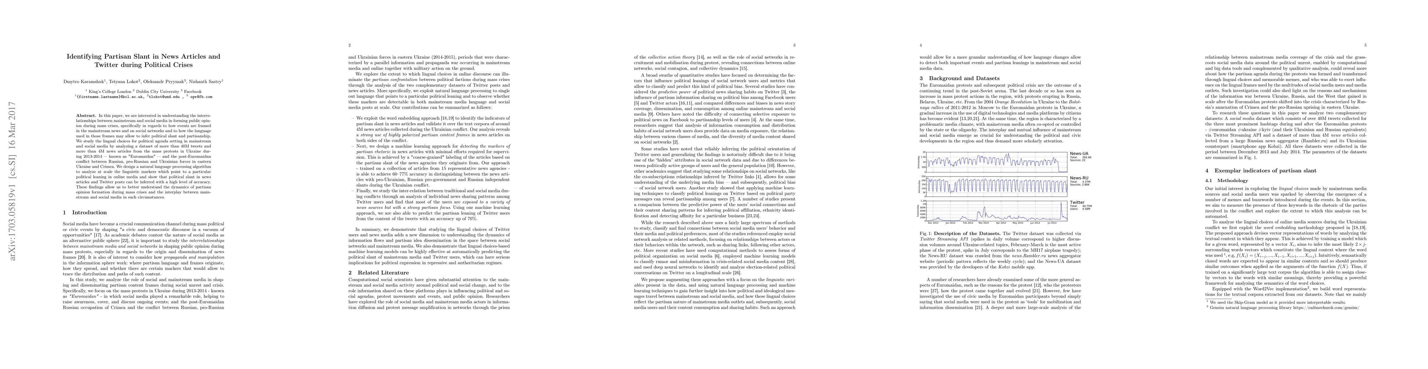 This research examines the political slant in mainstream news and social media during political crises, utilizing a dataset of over 40 million tweets and 4 million news articles from the Euromaidan protests and subsequent conflicts. The study employs a natural language processing algorithm to identify linguistic markers indicating political leanings, demonstrating high accuracy in inferring partisanship and providing insights into the dynamics of public opinion formation.