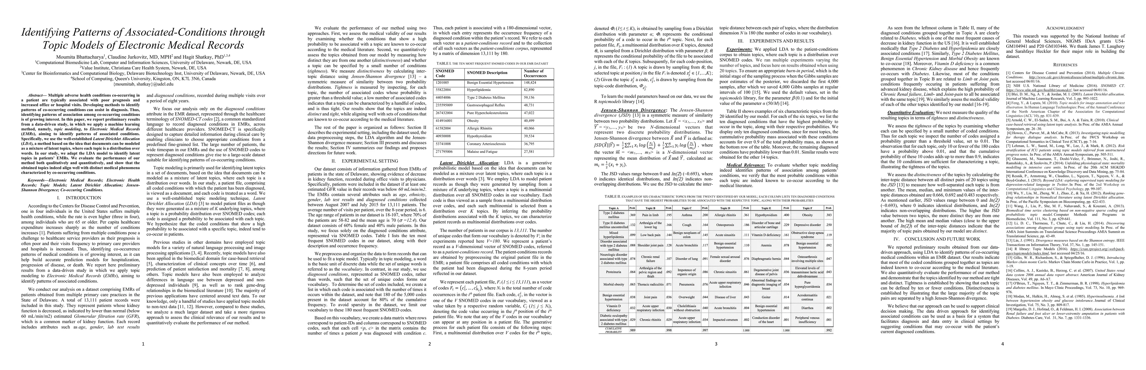 Multiple adverse health conditions co-occurring in a patient are typically associated with poor prognosis and increased office or hospital visits. Developing methods to identify patterns of co-occurring conditions can assist in diagnosis. Thus identifying patterns of associations among co-occurring conditions is of growing interest. In this paper, we report preliminary results from a data-driven study, in which we apply a machine learning method, namely, topic modeling, to electronic medical records, aiming to identify patterns of associated conditions. Specifically, we use the well established latent dirichlet allocation, a method based on the idea that documents can be modeled as a mixture of latent topics, where each topic is a distribution over words. In our study, we adapt the LDA model to identify latent topics in patients' EMRs. We evaluate the performance of our method both qualitatively, and show that the obtained topics indeed align well with distinct medical phenomena characterized by co-occurring conditions.