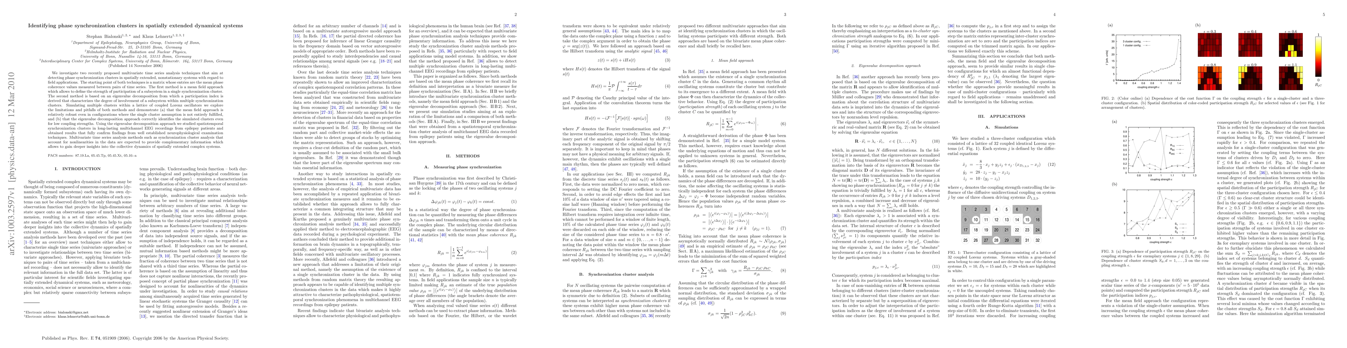 We investigate two recently proposed multivariate time series analysis techniques that aim at detecting phase synchronization clusters in spatially extended, nonstationary systems with regard to field applications. The starting point of both techniques is a matrix whose entries are the mean phase coherence values measured between pairs of time series. The first method is a mean field approach which allows to define the strength of participation of a subsystem in a single synchronization cluster. The second method is based on an eigenvalue decomposition from which a participation index is derived that characterizes the degree of involvement of a subsystem within multiple synchronization clusters. Simulating multiple clusters within a lattice of coupled Lorenz oscillators we explore the limitations and pitfalls of both methods and demonstrate (a) that the mean field approach is relatively robust even in configurations where the single cluster assumption is not entirely fulfilled, and (b) that the eigenvalue decomposition approach correctly identifies the simulated clusters even for low coupling strengths. Using the eigenvalue decomposition approach we studied spatiotemporal synchronization clusters in long-lasting multichannel EEG recordings from epilepsy patients and obtained results that fully confirm findings from well established neurophysiological examination techniques. Multivariate time series analysis methods such as synchronization cluster analysis that account for nonlinearities in the data are expected to provide complementary information which allows to gain deeper insights into the collective dynamics of spatially extended complex systems.