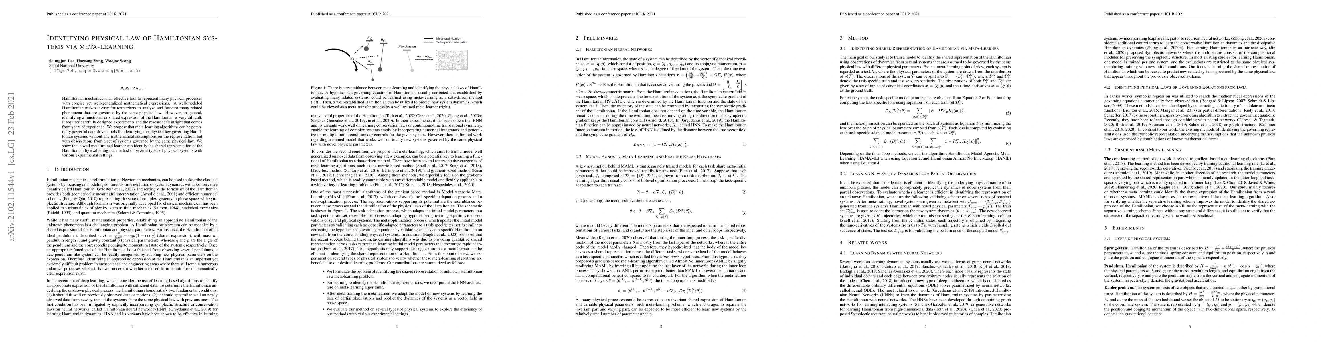 Hamiltonian mechanics is an effective tool to represent many physical processes with concise yet well-generalized mathematical expressions. A well-modeled Hamiltonian makes it easy for researchers to analyze and forecast many related phenomena that are governed by the same physical law. However, in general, identifying a functional or shared expression of the Hamiltonian is very difficult. It requires carefully designed experiments and the researcher's insight that comes from years of experience. We propose that meta-learning algorithms can be potentially powerful data-driven tools for identifying the physical law governing Hamiltonian systems without any mathematical assumptions on the representation, but with observations from a set of systems governed by the same physical law. We show that a well meta-trained learner can identify the shared representation of the Hamiltonian by evaluating our method on several types of physical systems with various experimental settings.