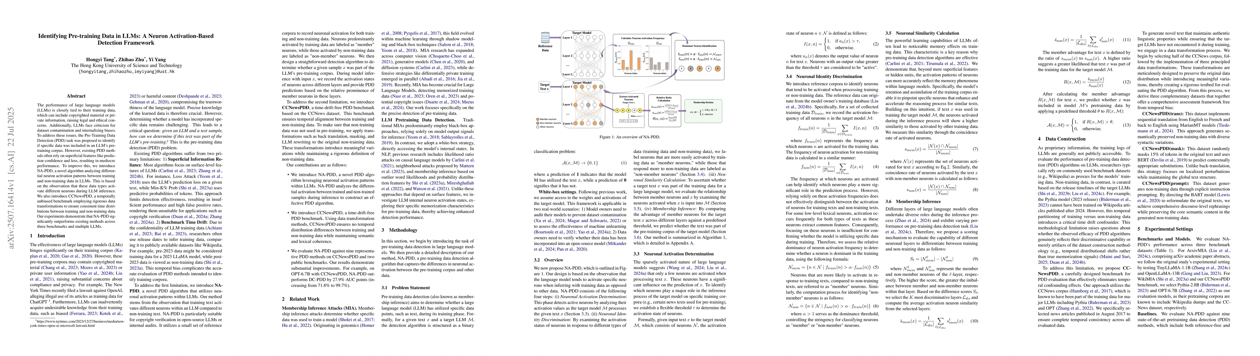 The performance of large language models (LLMs) is closely tied to their training data, which can include copyrighted material or private information, raising legal and ethical concerns. Additionally, LLMs face criticism for dataset contamination and internalizing biases. To address these issues, the Pre-Training Data Detection (PDD) task was proposed to identify if specific data was included in an LLM's pre-training corpus. However, existing PDD methods often rely on superficial features like prediction confidence and loss, resulting in mediocre performance. To improve this, we introduce NA-PDD, a novel algorithm analyzing differential neuron activation patterns between training and non-training data in LLMs. This is based on the observation that these data types activate different neurons during LLM inference. We also introduce CCNewsPDD, a temporally unbiased benchmark employing rigorous data transformations to ensure consistent time distributions between training and non-training data. Our experiments demonstrate that NA-PDD significantly outperforms existing methods across three benchmarks and multiple LLMs.
