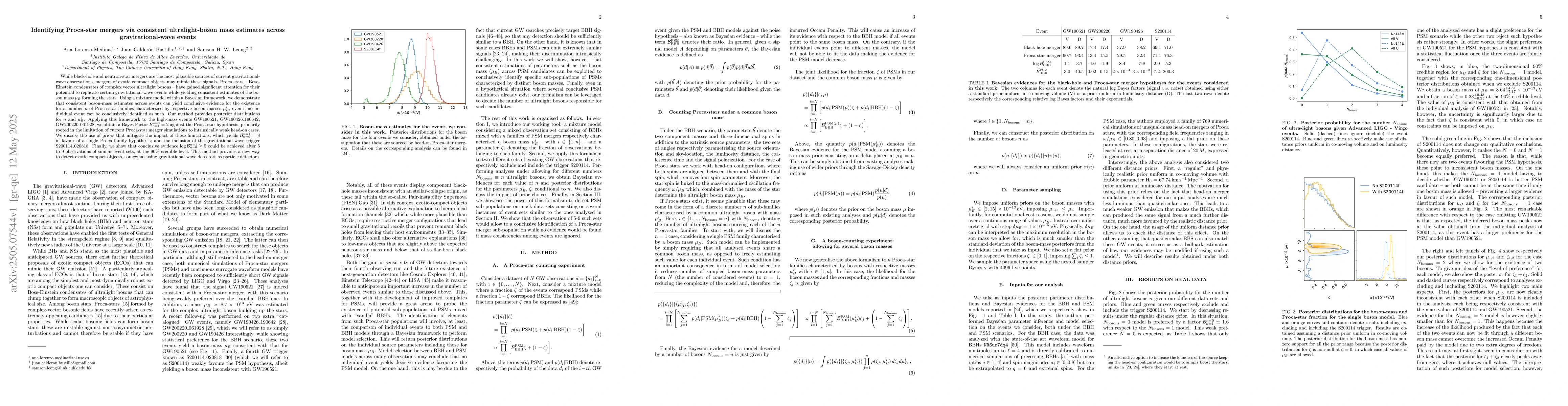 The development and application of a Bayesian mixture model within a gravitational-wave analysis framework to identify consistent ultralight-boson mass estimates indicative of Proca-star mergers.