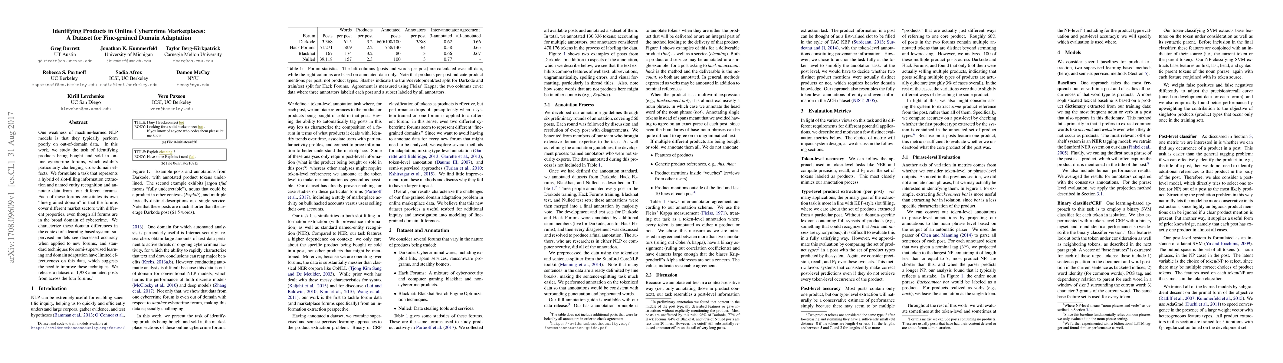 One weakness of machine-learned NLP models is that they typically perform poorly on out-of-domain data. In this work, we study the task of identifying products being bought and sold in online cybercrime forums, which exhibits particularly challenging cross-domain effects. We formulate a task that represents a hybrid of slot-filling information extraction and named entity recognition and annotate data from four different forums. Each of these forums constitutes its own "fine-grained domain" in that the forums cover different market sectors with different properties, even though all forums are in the broad domain of cybercrime. We characterize these domain differences in the context of a learning-based system: supervised models see decreased accuracy when applied to new forums, and standard techniques for semi-supervised learning and domain adaptation have limited effectiveness on this data, which suggests the need to improve these techniques. We release a dataset of 1,938 annotated posts from across the four forums.