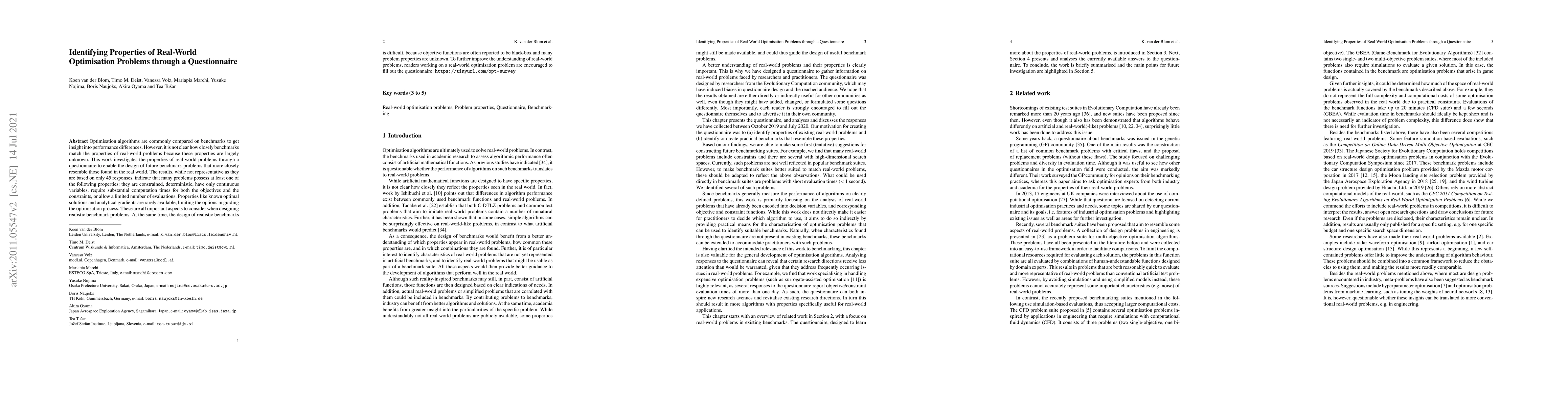 This study uses a questionnaire to identify properties of real-world optimisation problems, aiming to design more realistic benchmarks. Initial findings suggest that real-world problems often have constraints, require substantial computation, and allow limited evaluations, while known optimal solutions and analytical gradients are rare.