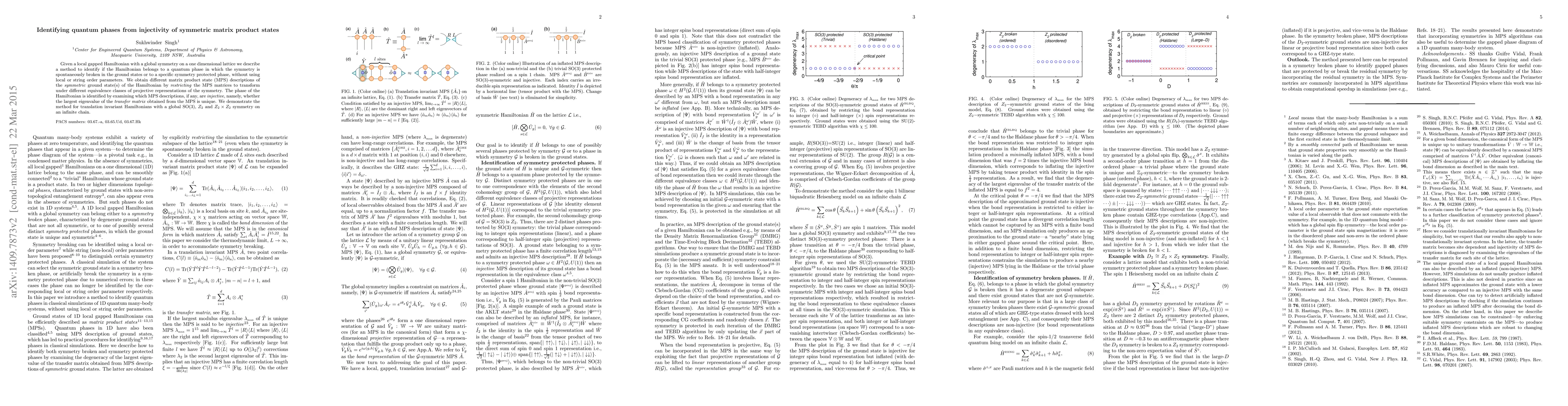 Given a local gapped Hamiltonian with a global symmetry on a one dimensional lattice we describe a method to identify if the Hamiltonian belongs to a quantum phase in which the symmetry is spontaneously broken in the ground states or to a specific symmetry protected phase, without using local or string order parameters. We obtain different matrix product state (MPS) descriptions of the symmetric ground state(s) of the Hamiltonian by restricting the MPS matrices to transform under different projective representations of the symmetry. The phase of the Hamiltonian is identified by examining which MPS descriptions, if any, are injective, namely, whether the largest eigenvalue of the "transfer matrix" obtained from the MPS is unique. We demonstrate the method for translation invariant Hamiltonians with a global SO(3), Z_2 and Z_2 x Z_2 symmetry on an infinite chain.