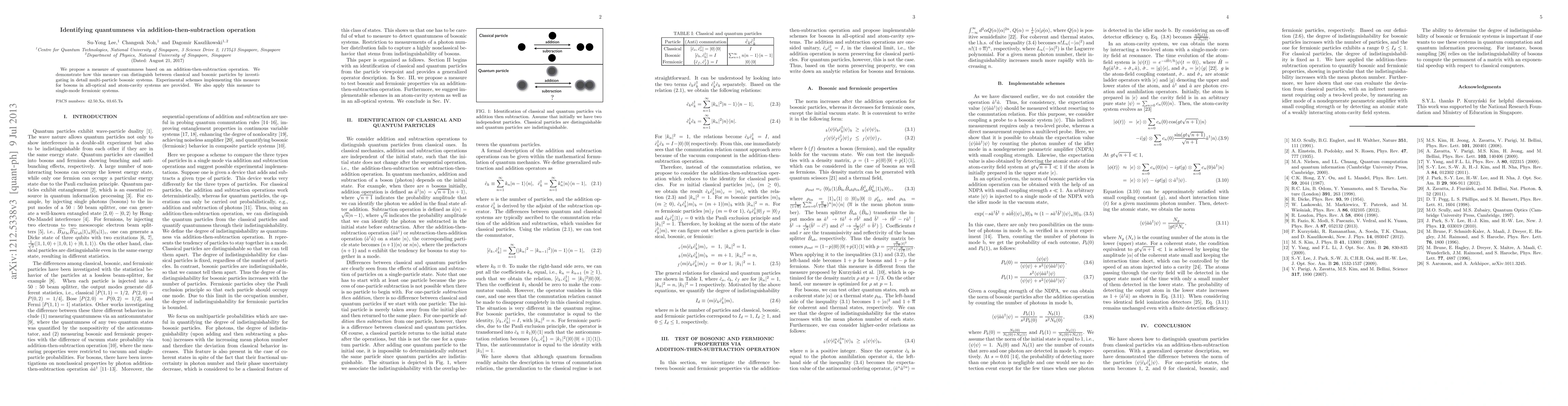 We propose a measure of quantumness based on an addition-then-subtraction operation. We demonstrate how this measure can distinguish between classical and bosonic particles by investigating in detail multi-particle bosonic systems. Experimental schemes implementing this measure for bosons in all-optical and atom-cavity systems are provided. We also apply this measure to single-mode fermionic systems.