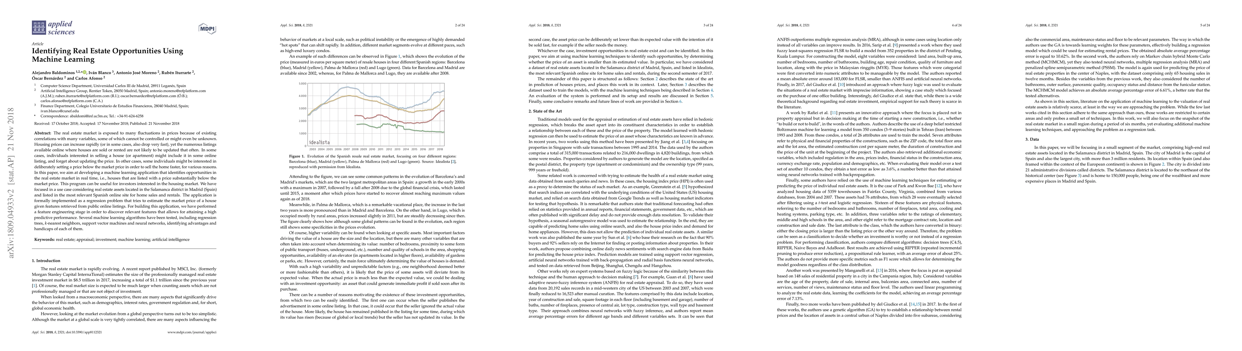The real estate market is exposed to many fluctuations in prices because of existing correlations with many variables, some of which cannot be controlled or might even be unknown. Housing prices can increase rapidly (or in some cases, also drop very fast), yet the numerous listings available online where houses are sold or rented are not likely to be updated that often. In some cases, individuals interested in selling a house (or apartment) might include it in some online listing, and forget about updating the price. In other cases, some individuals might be interested in deliberately setting a price below the market price in order to sell the home faster, for various reasons. In this paper, we aim at developing a machine learning application that identifies opportunities in the real estate market in real time, i.e., houses that are listed with a price substantially below the market price. This program can be useful for investors interested in the housing market. We have focused in a use case considering real estate assets located in the Salamanca district in Madrid (Spain) and listed in the most relevant Spanish online site for home sales and rentals. The application is formally implemented as a regression problem that tries to estimate the market price of a house given features retrieved from public online listings. For building this application, we have performed a feature engineering stage in order to discover relevant features that allows for attaining a high predictive performance. Several machine learning algorithms have been tested, including regression trees, k-nearest neighbors, support vector machines and neural networks, identifying advantages and handicaps of each of them.