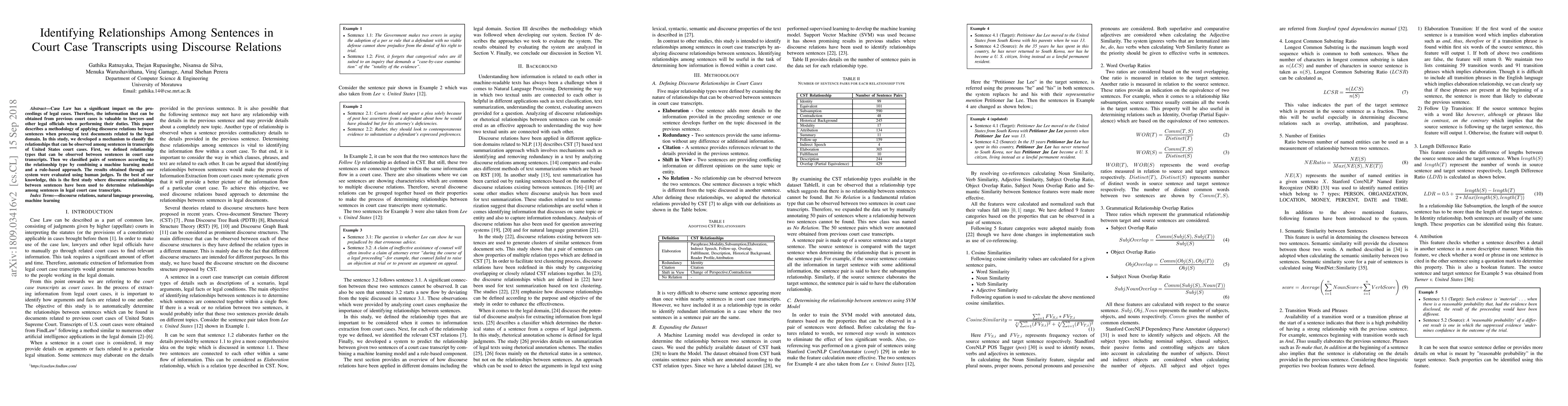 Case Law has a significant impact on the proceedings of legal cases. Therefore, the information that can be obtained from previous court cases is valuable to lawyers and other legal officials when performing their duties. This paper describes a methodology of applying discourse relations between sentences when processing text documents related to the legal domain. In this study, we developed a mechanism to classify the relationships that can be observed among sentences in transcripts of United States court cases. First, we defined relationship types that can be observed between sentences in court case transcripts. Then we classified pairs of sentences according to the relationship type by combining a machine learning model and a rule-based approach. The results obtained through our system were evaluated using human judges. To the best of our knowledge, this is the first study where discourse relationships between sentences have been used to determine relationships among sentences in legal court case transcripts.