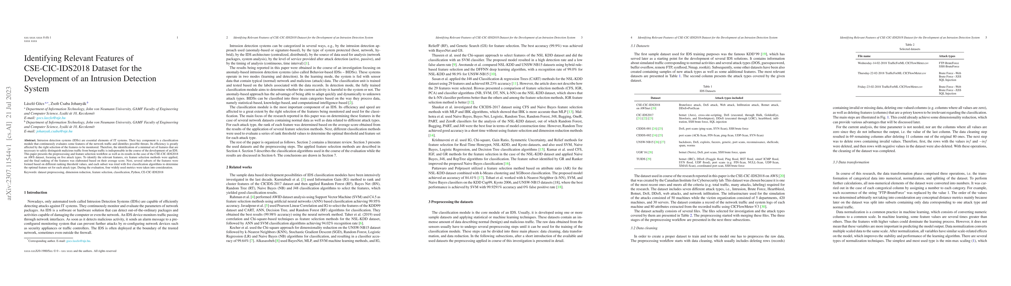 This paper identifies a minimal set of relevant features from the CSE-CIC-IDS2018 dataset for developing an efficient intrusion detection system, applying six feature selection methods and evaluating five attack types. The optimal feature set is determined through classification algorithm testing and performance metrics analysis.