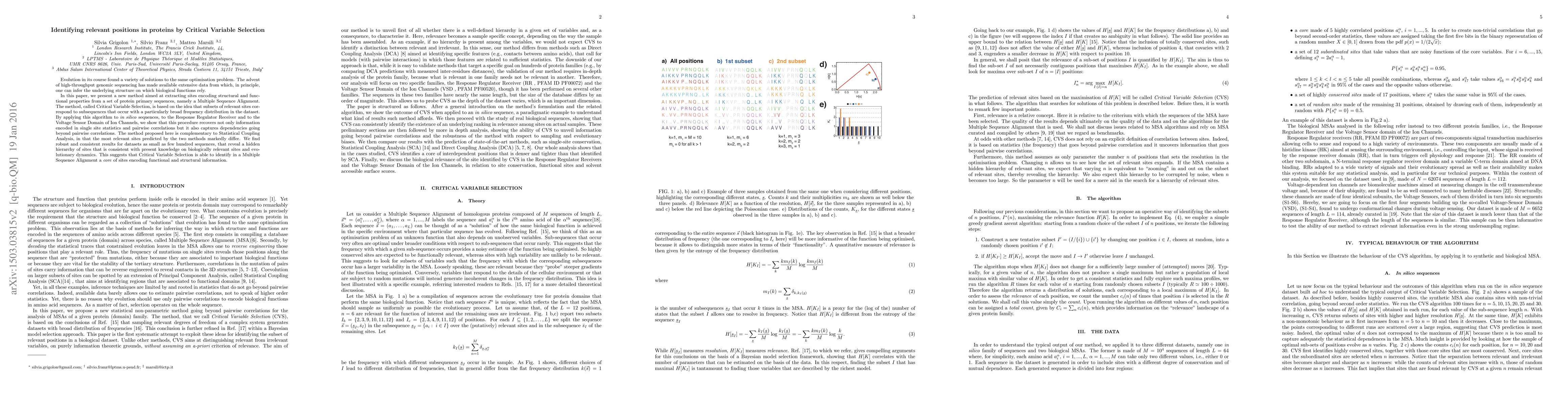 Evolution in its course found a variety of solutions to the same optimisation problem. The advent of high-throughput genomic sequencing has made available extensive data from which, in principle, one can infer the underlying structure on which biological functions rely. In this paper, we present a new method aimed at extracting sites encoding structural and func- tional properties from a set of protein primary sequences, namely a Multiple Sequence Alignment. The method, called Critical Variable Selection, is based on the idea that subsets of relevant sites cor- respond to subsequences that occur with a particularly broad frequency distribution in the dataset. By applying this algorithm to in silico sequences, to the Response Regulator Receiver and to the Voltage Sensor Domain of Ion Channels, we show that this procedure recovers not only information encoded in single site statistics and pairwise correlations but it also captures dependencies going beyond pairwise correlations. The method proposed here is complementary to Statistical Coupling Analysis, in that the most relevant sites predicted by the two methods markedly differ. We find robust and consistent results for datasets as small as few hundred sequences, that reveal a hidden hierarchy of sites that is consistent with present knowledge on biologically relevant sites and evo- lutionary dynamics. This suggests that Critical Variable Selection is able to identify in a Multiple Sequence Alignment a core of sites encoding functional and structural information.