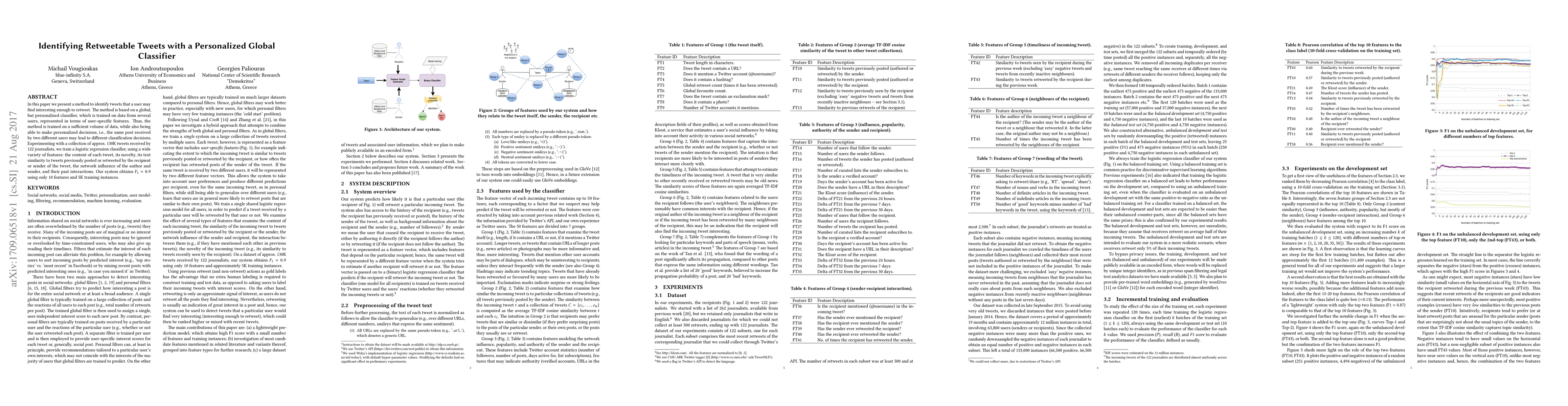 In this paper we present a method to identify tweets that a user may find interesting enough to retweet. The method is based on a global, but personalized classifier, which is trained on data from several users, represented in terms of user-specific features. Thus, the method is trained on a sufficient volume of data, while also being able to make personalized decisions, i.e., the same post received by two different users may lead to different classification decisions. Experimenting with a collection of approx.\ 130K tweets received by 122 journalists, we train a logistic regression classifier, using a wide variety of features: the content of each tweet, its novelty, its text similarity to tweets previously posted or retweeted by the recipient or sender of the tweet, the network influence of the author and sender, and their past interactions. Our system obtains F1 approx. 0.9 using only 10 features and 5K training instances.