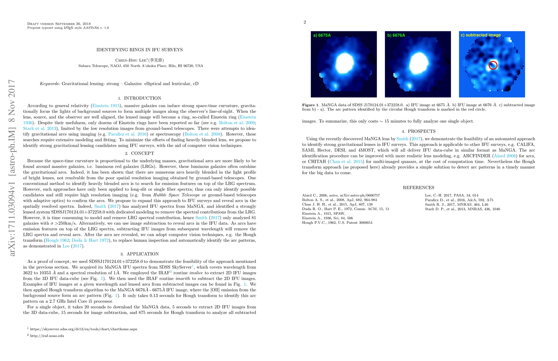 Gravitational lensings provide unique opportunities to study distant galaxies. Despite their usefulness, only a dozens of gravitational arcs have been reported up-to-date, hampered by the low resolution imaging from ground-based surveys. We propose a novel method to identify Einstein rings/arcs in the IFU surveys via image subtraction and computer vision techniques. We use the recent discovered strong lens system in the MaNGA survey as a proof-of-concept; in addition to MaNGA, our approach is applicable to other IFU surveys, such as SAMI, CALIFA, Hector, DESI, and 4MOST.