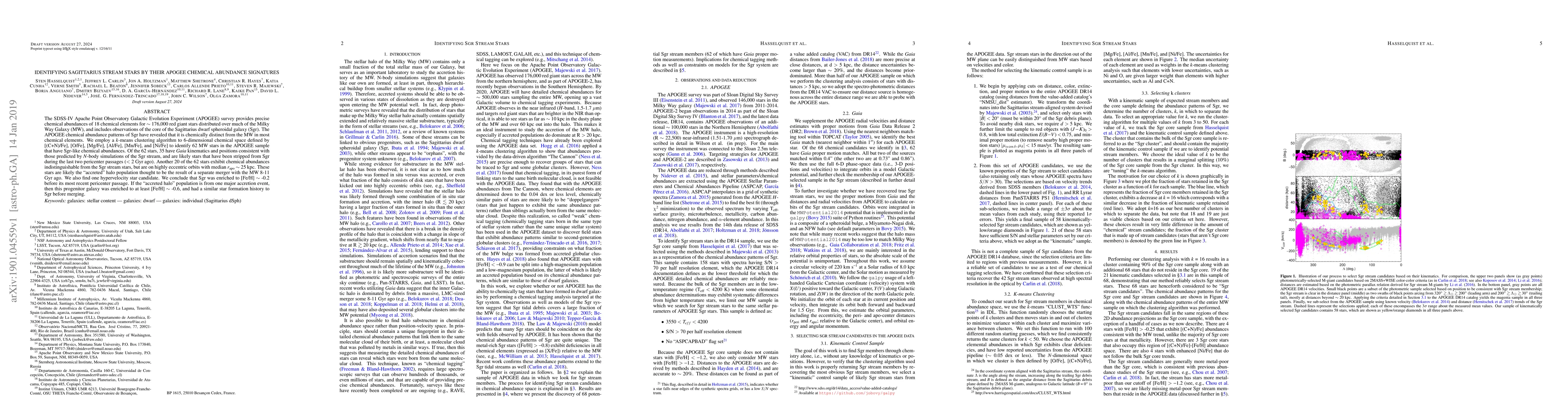 This paper identifies stars in the Milky Way with chemical abundances similar to the Sagittarius (Sgr) dwarf galaxy using the APOGEE survey data. It finds 62 such stars, 35 of which align with the Sgr stream's predicted kinematics, suggesting they were recently stripped from Sgr, while another 20 likely belong to an older accreted halo population.