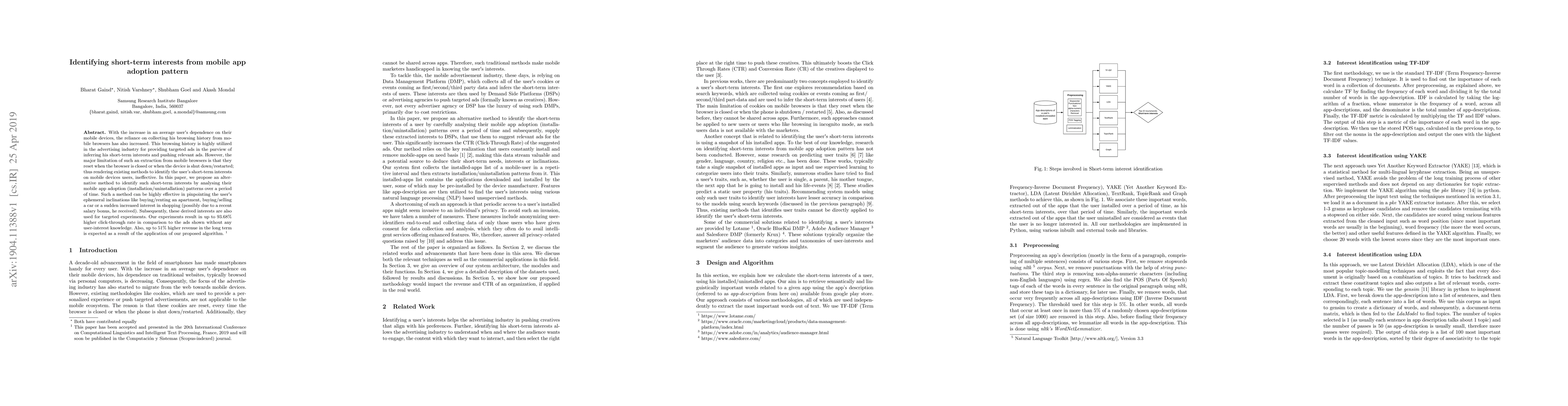 This paper proposes a novel method to identify short-term user interests by analyzing mobile app adoption patterns, overcoming the limitations of traditional browsing history methods. The results show significant improvements in click-through rates and long-term revenue from targeted advertising.